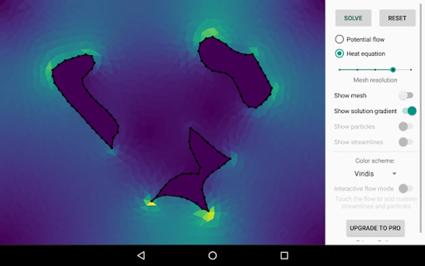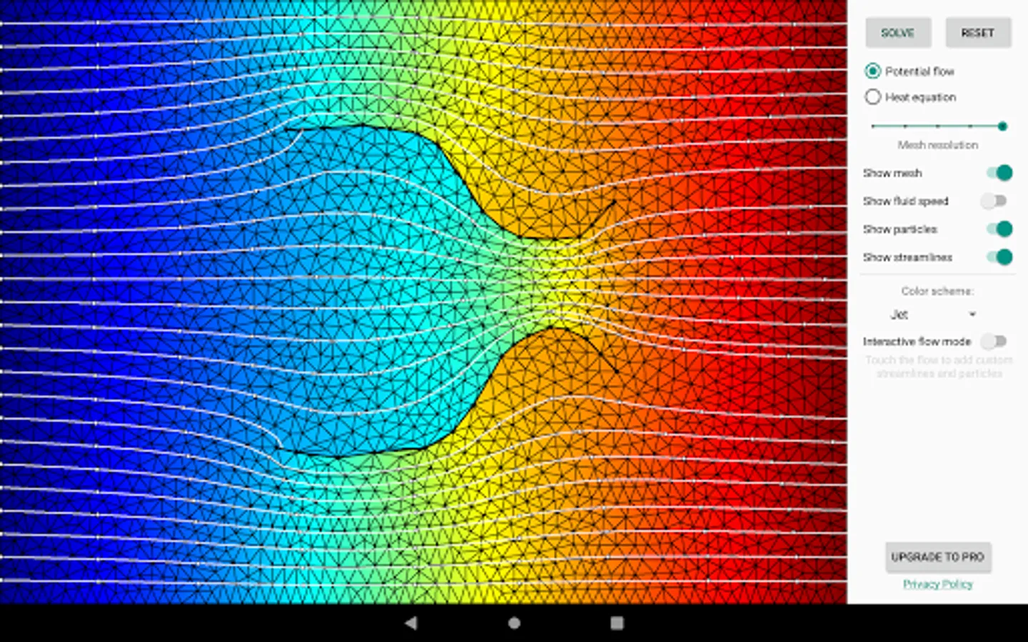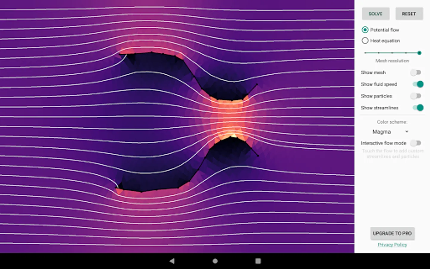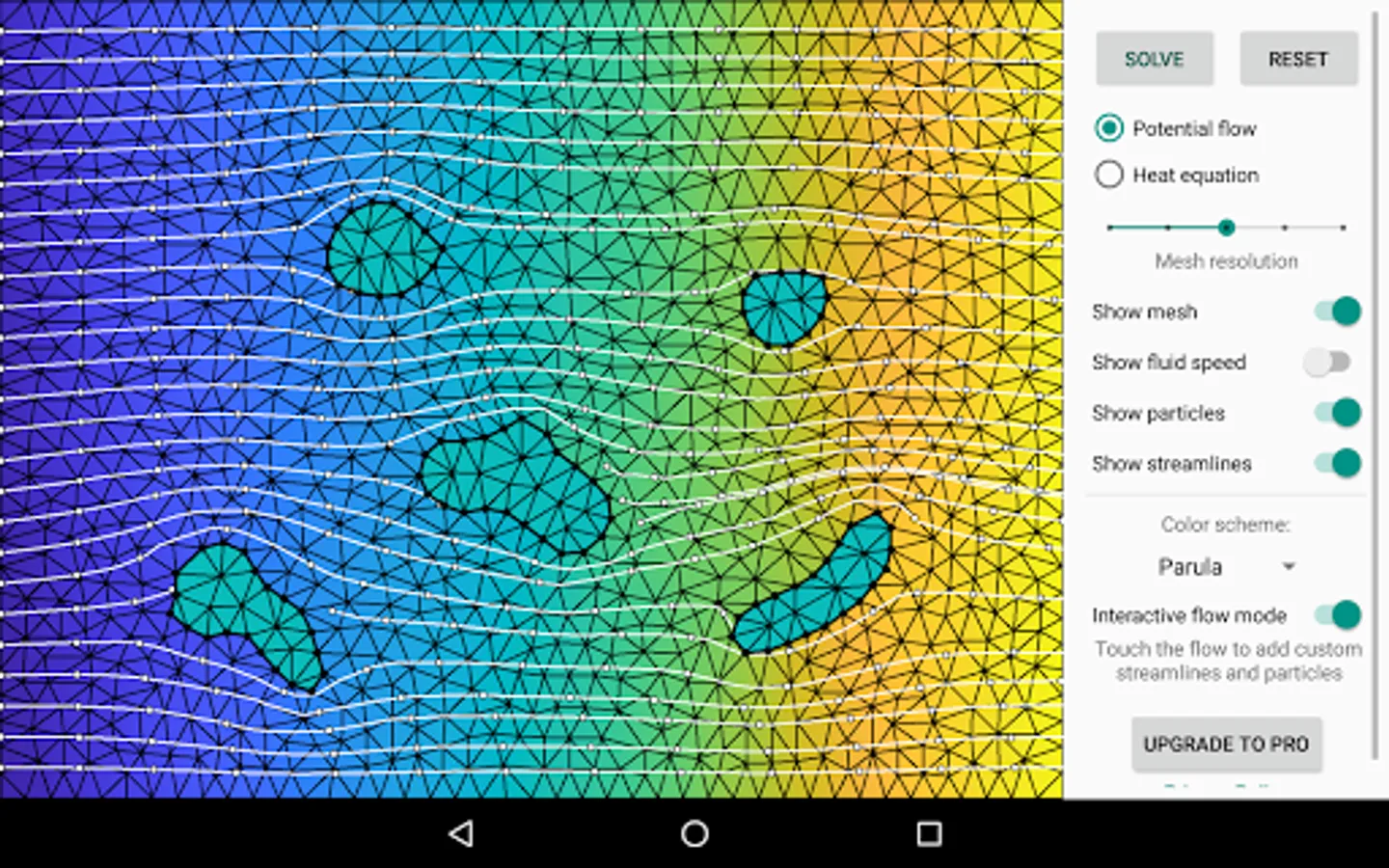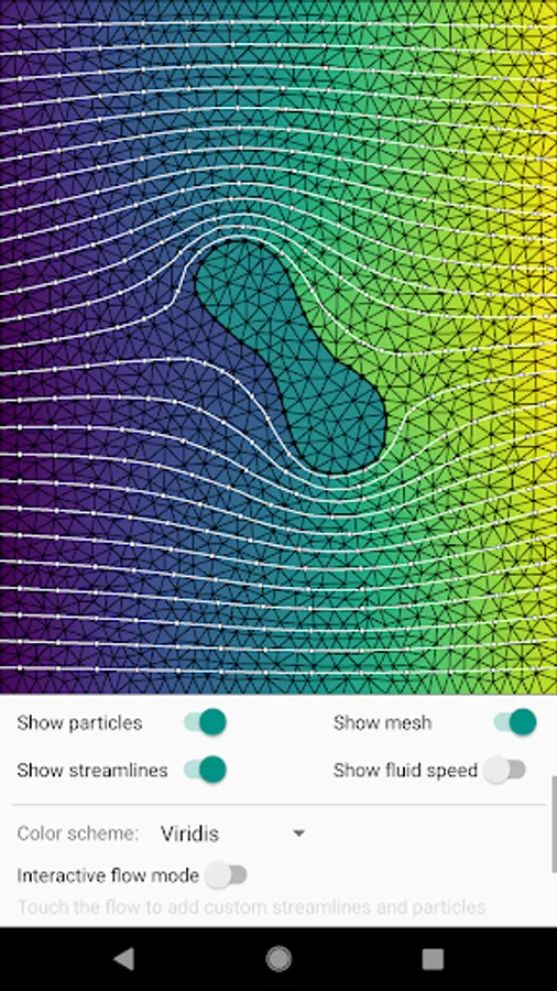 The app also allows you to change the mesh resolution, and offers options for visualizing the solution and its gradient using a variety of different color schemes. meshFlow can generate streamlines and animate particles in the flow, and also offers an "interactive flow" mode where you can manually add particles to any location in the flow.