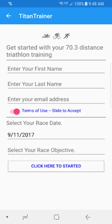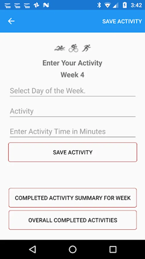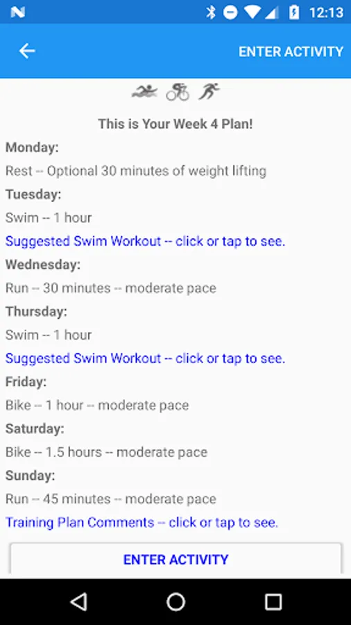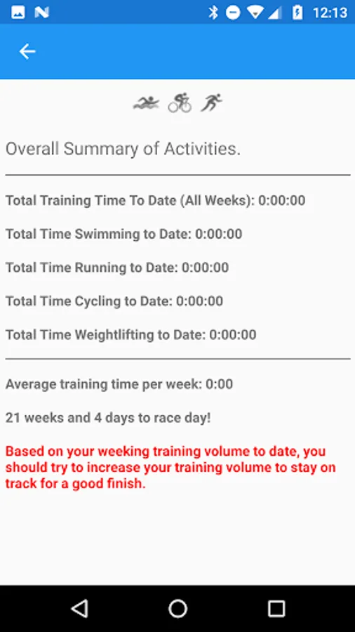 Triathlon training app to help you complete a Sprint, Olympic, 70.3 distance (1.2 mile swim, 56 mile bike segment and 13.1 mile run segment) and 140.6 distance (2.4 mile swim, 112 mile bike segment and 26.2 mile run segment) triathlon. Designed for all level athletes, including those who have not participated in a triathlon event before, as well as intermediate and advanced athletes. A 20 week triathlon training app designed to get you to the finish line. Daily run, swim, bike and optional weightlifting activities are provided. Log your activities so you can monitor your weekly progress and see if you are on track for a good finish. Weekly progress by total time and activity time provided in numeric format and in chart form.
