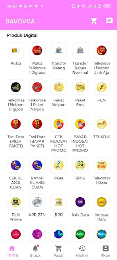 provides credit and packages for all operators, data packages, call packages, prepaid PLN, TOPUP Games, E-Commerce, PPOB payments such as Postpaid PLN, Indie Home, BPJS, PGN GAS, Finance and many more.