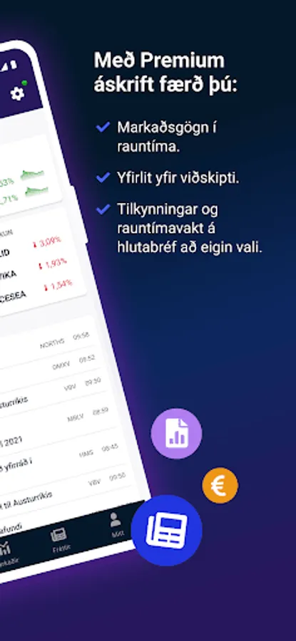 Please note that even if a lot of the features are free of charge you will need to buy a monthly subscription to "Keldan Premium" to gain access to premium features of the app and access to real time market data.