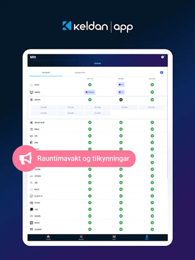 Vinsamlegast athugið að þó mikið af virkninni sé gjaldfrjáls þá þarf að kaupa mánaðar áskrift að "Keldan Premium" til að fá aðgang að "Premium" virkni appsins og fá aðgang að rauntíma markaðsupplýsingum.