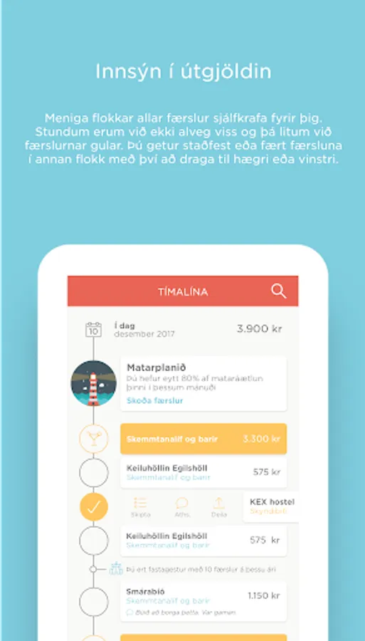 * Smelltu á færslu og fáðu heildaryfirsýn síðustu mánaða yfir þína eyðslu í viðkomandi flokki og verslun