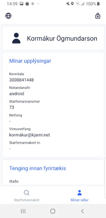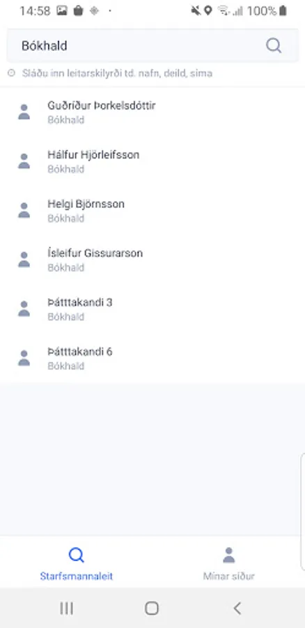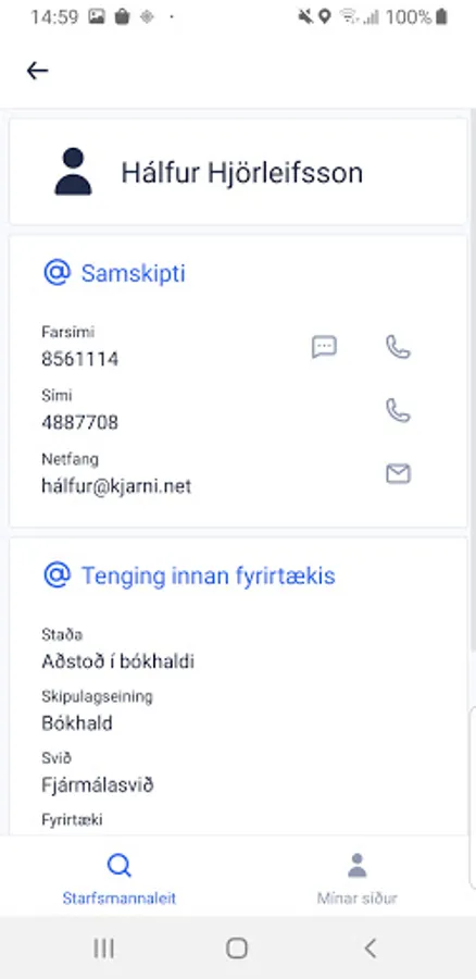 In the Kjarna app, employees can access basic information about their colleagues, e.g. job title, phone number and email address. In the app, you can search for colleagues by name, job title, phone number, etc. as well as being able to call or send an email directly from the app.