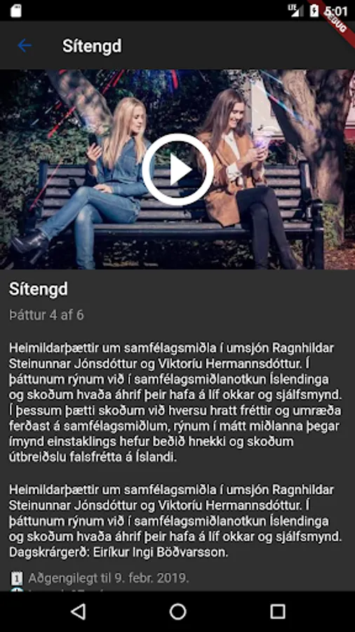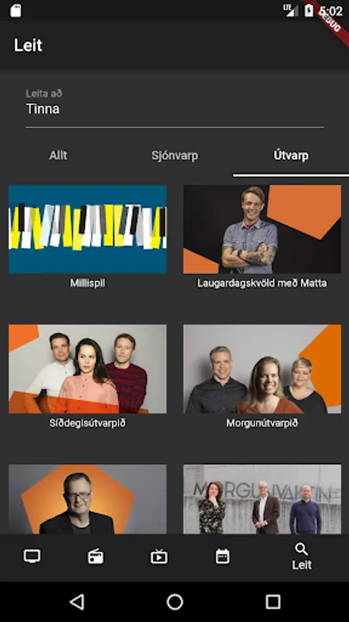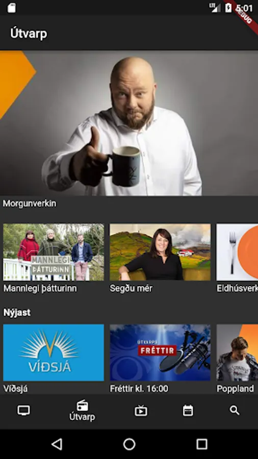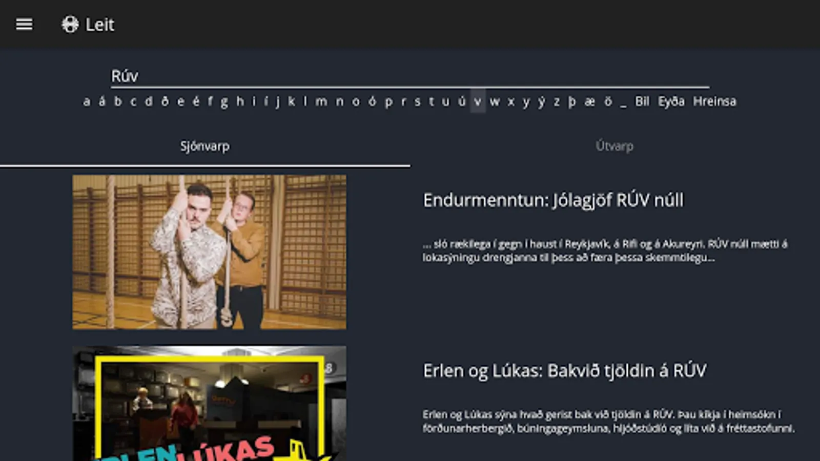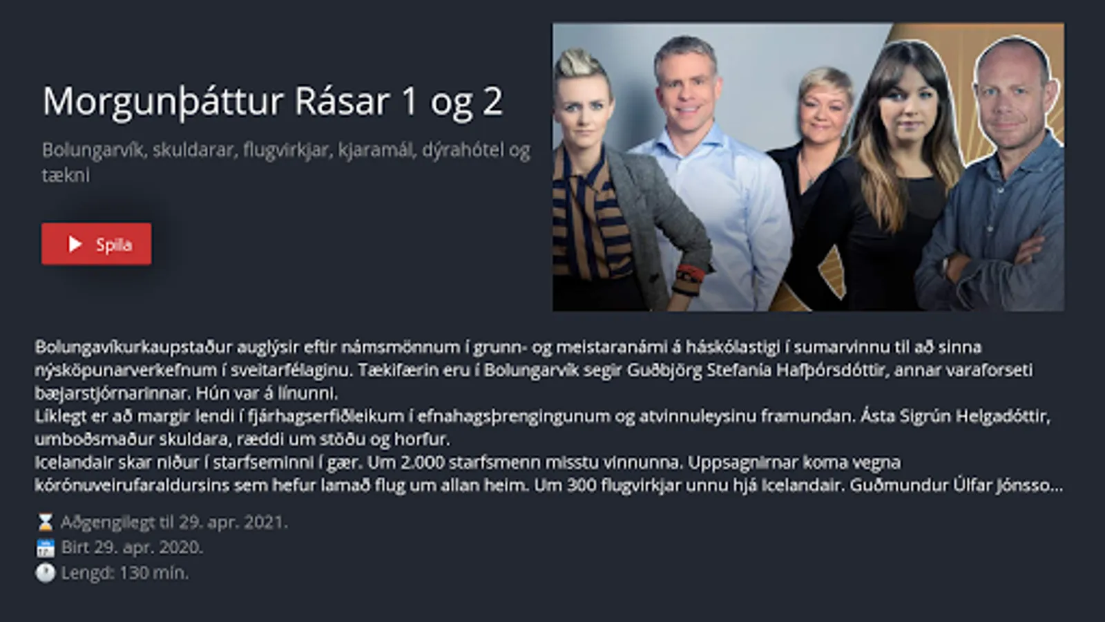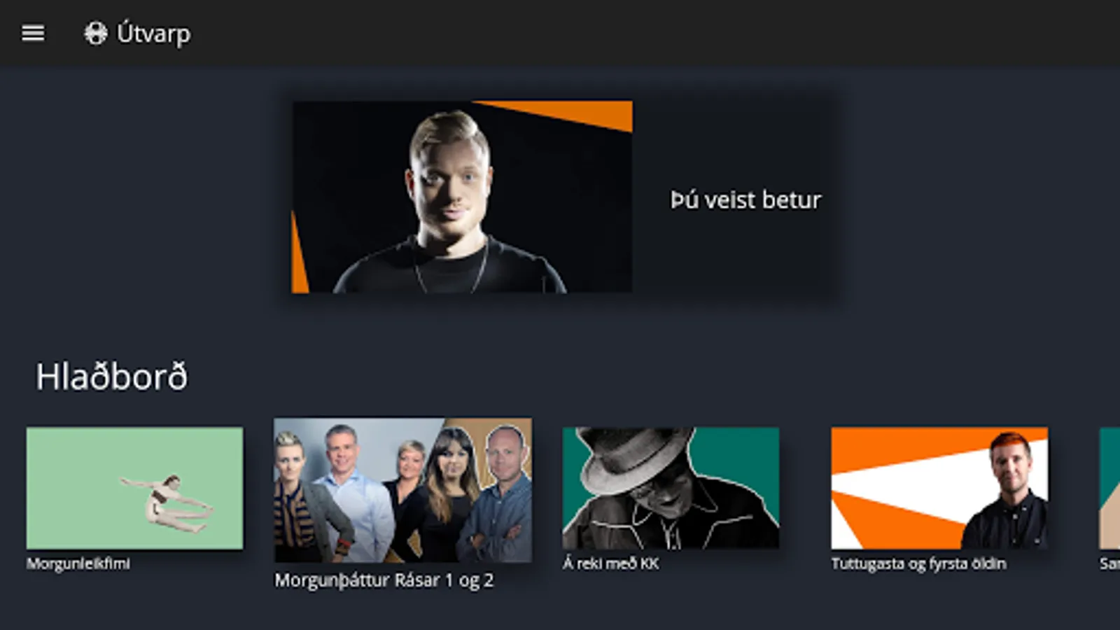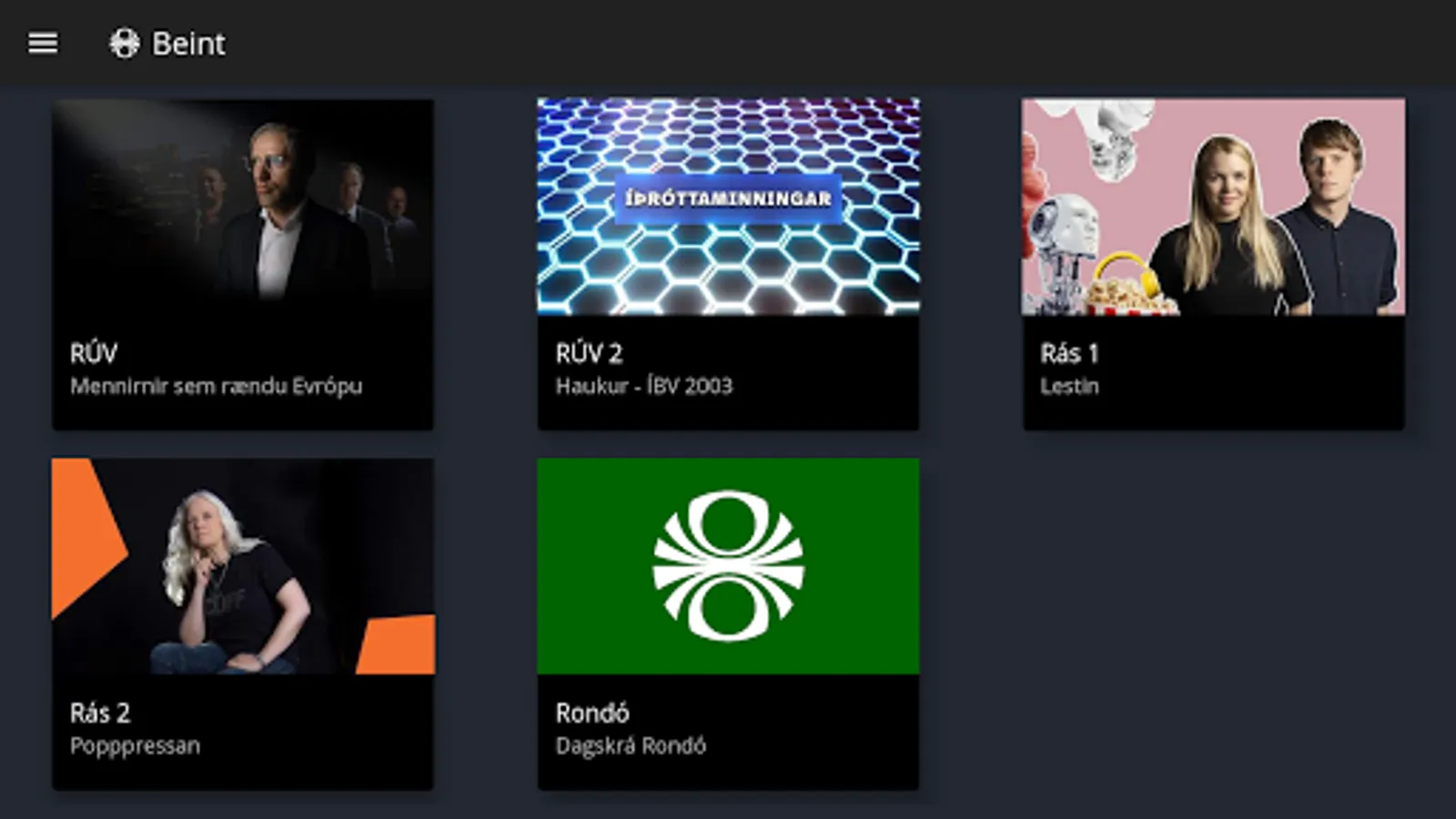 RUV plays Icelandic tv and radio channels from The Icelandic National Broadcasting Service. There are featured tv and radio panels, search and schedule.