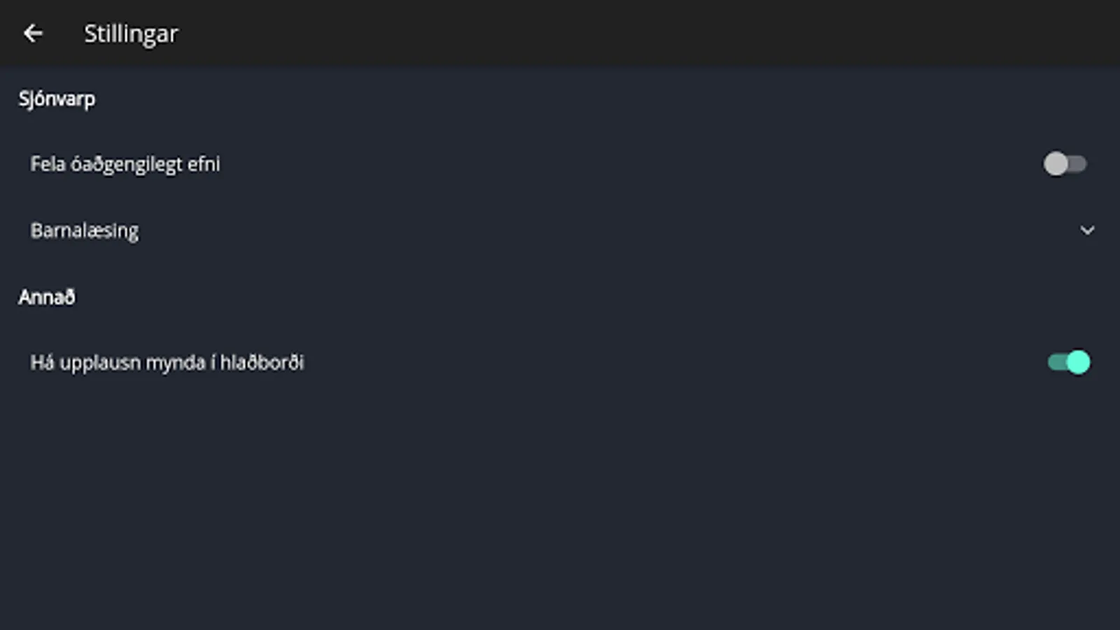 All the tv shows are in Icelandic or have Icelandic subtitles. The radio is in Icelandic also. Many of the tv shows are restricted and thus, can not be watched outside of Iceland.