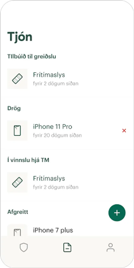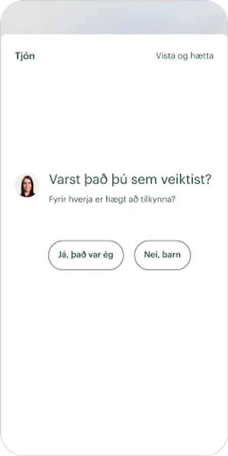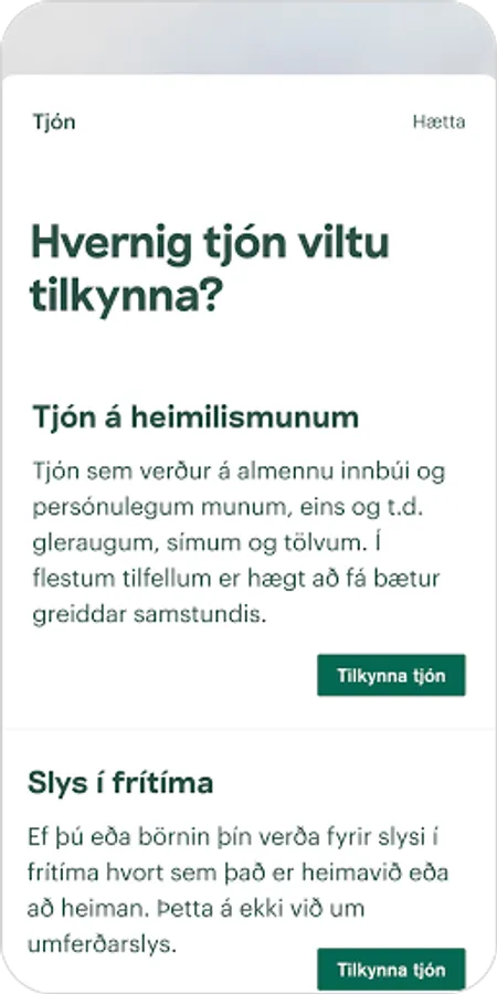 * Tilkynna tjón til TM þegar fjölskyldumeðlimur hefur orðið fyrir slysi innanlands í frítíma sínum.