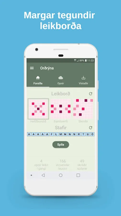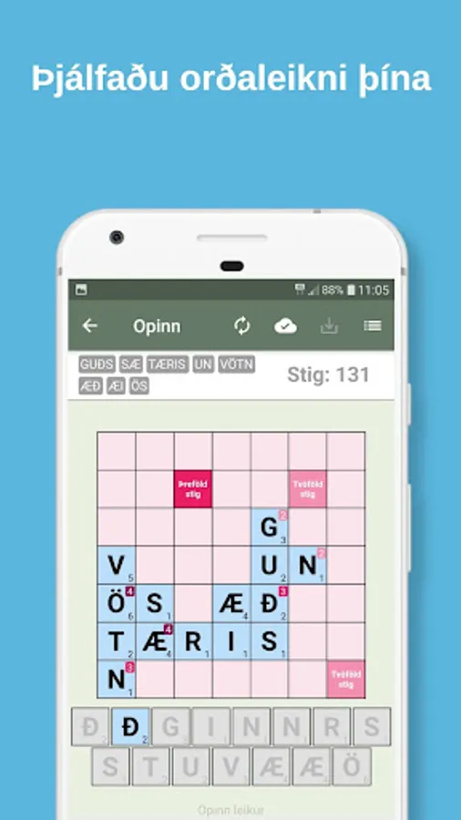 Literacy is a fun and free word game in Icelandic for all ages. Both solitude and open games are offered, with enthusiasts competing to reach as many levels as possible within 24 hours of the opening of the game.