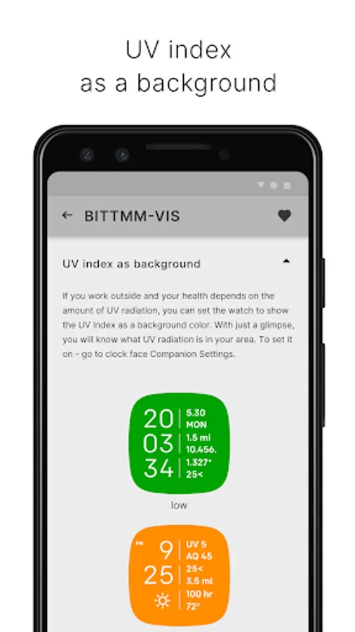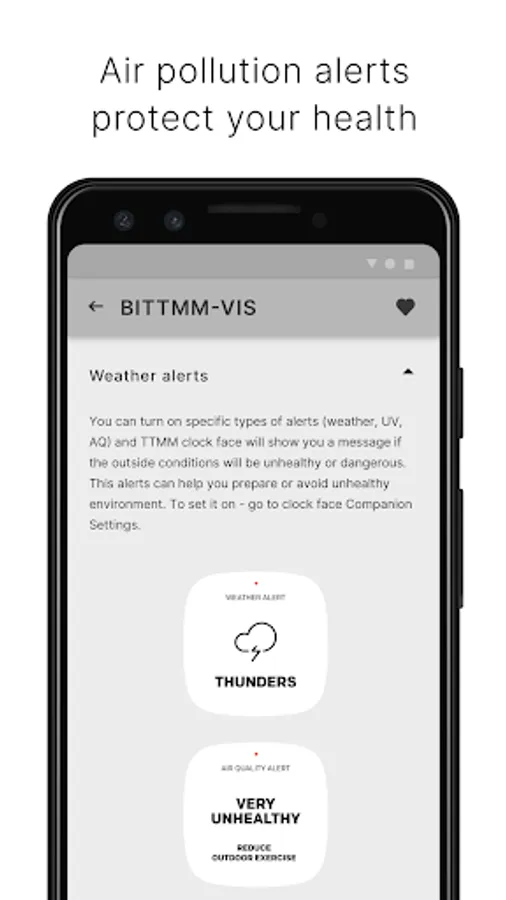 Watch faces are equipped with three innovative types of alerts: dangerous weather conditions, very high UV radiation, or unhealthy Air Quality. The clock face will display a message when the outside conditions turn unhealthy or dangerous. Air pollution alarms can help you to reduce COVID transmission and help protect your health against many diseases.