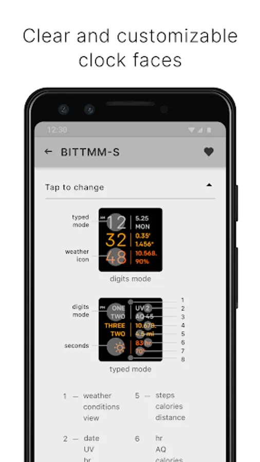 This collection comprises originally designed clock faces bundled into categories: the Digitals, the Analogs, the Abstract, and the Once. All the clock faces are equipped with the tap on-screen complications setting feature, which makes them very easily customizable to your preferences. You can also add clock faces to your favorite list by tapping the heart icon and then quickly upload the chosen clock face just by tapping the upload icon. Tap the heart icon again to remove the item from the favorites list. The app has a minimal interface with fast and easy access to upload your favorite clock faces.