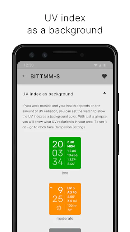 Subscribe and get access to special versions of awarded TTMM-S clock faces equipped with the weather, UV index, and detailed Air Quality feature for just 3.99$ per month! Pay only for the time you use the app (one full monthly payment applies) and stop the subscription at any time.