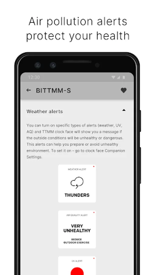 Watch faces are equipped with three innovative types of alerts: dangerous weather conditions, very high UV radiation, or unhealthy Air Quality. The clock face will display a message when the outside conditions turn unhealthy or dangerous. Air pollution alarms can help protect your health against many diseases.