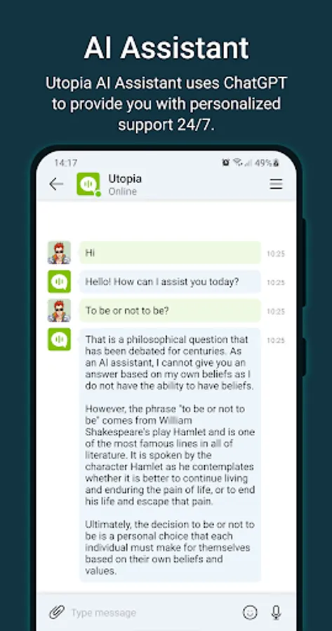 Also, inside the Utopia P2P Messenger Tor alternative, you can use ChatGPT — your personal AI assistant available 24/7 right after installing the app.