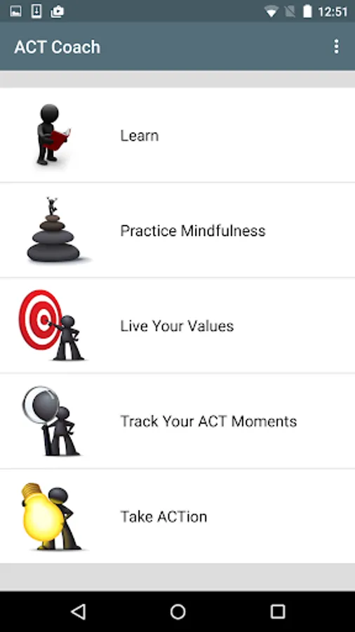 ACT Coach was developed for Veterans, Servicemembers, and other people who are in Acceptance and Commitment Therapy in consultation with a therapist. It offers exercises, tools, information, and tracking logs so you can practice what you’re learning in your daily life.