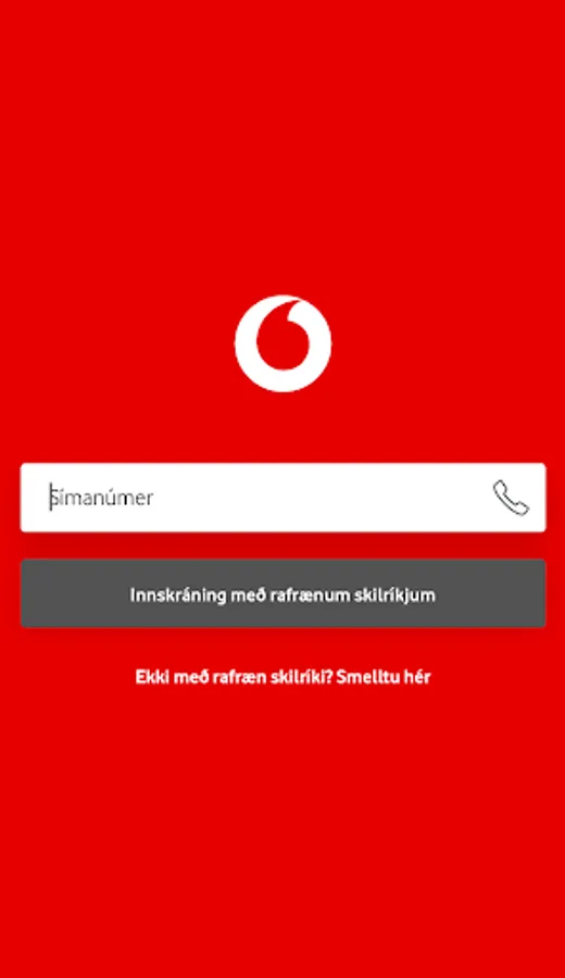 Í Vodafone appinu sérðu upplýsingar um alla þína þjónustu hjá Vodafone og notkun hennar. Hægt er að innskrá sig í appið með rafrænum skilríkum eða með símanúmeri og SMS.