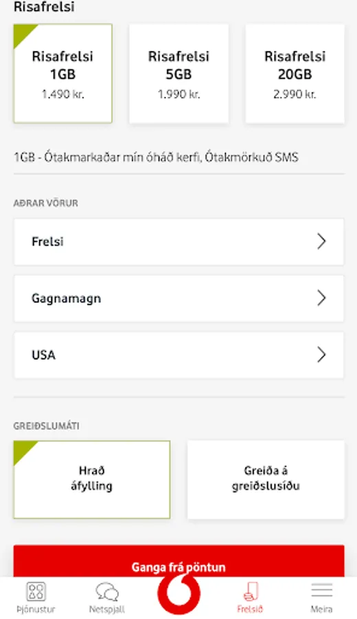 - Keypt inneignir og gagnamagn fyrir frelsisnúmer og 4G netfrelsi með greiðslukorti eða með hraðáfyllingum.