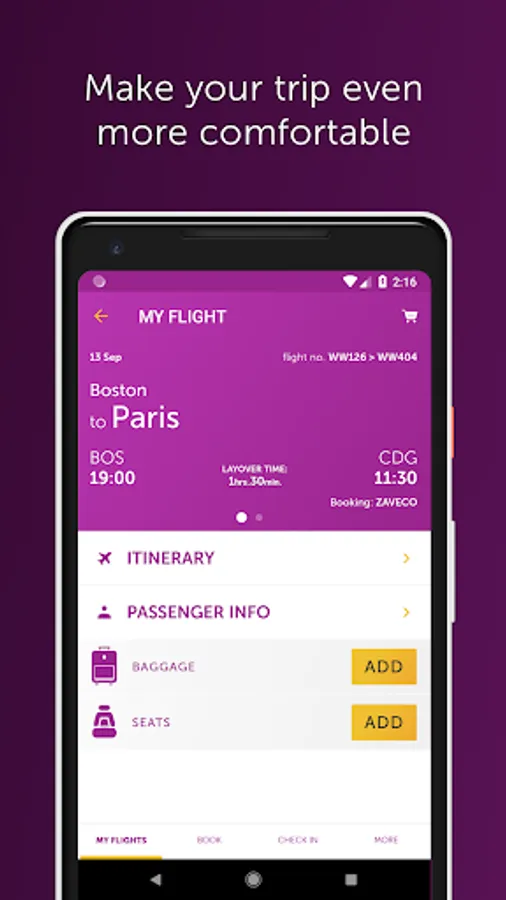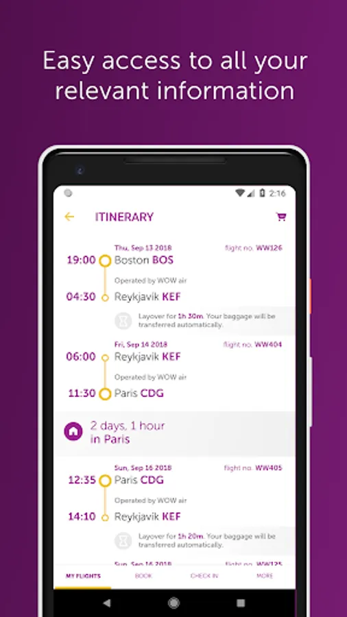 Search cheap fares, book, and manage your WOW air flights on the go with your own personal flight apptendant. With the WOW air app you can easily access all your travel documents and track your flights from the comfort of your... well, everywhere. Download the WOW air app for free and get started now!
