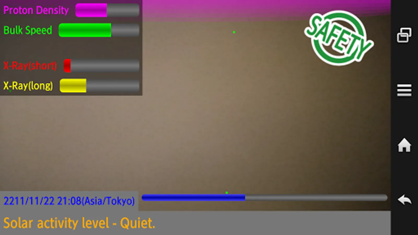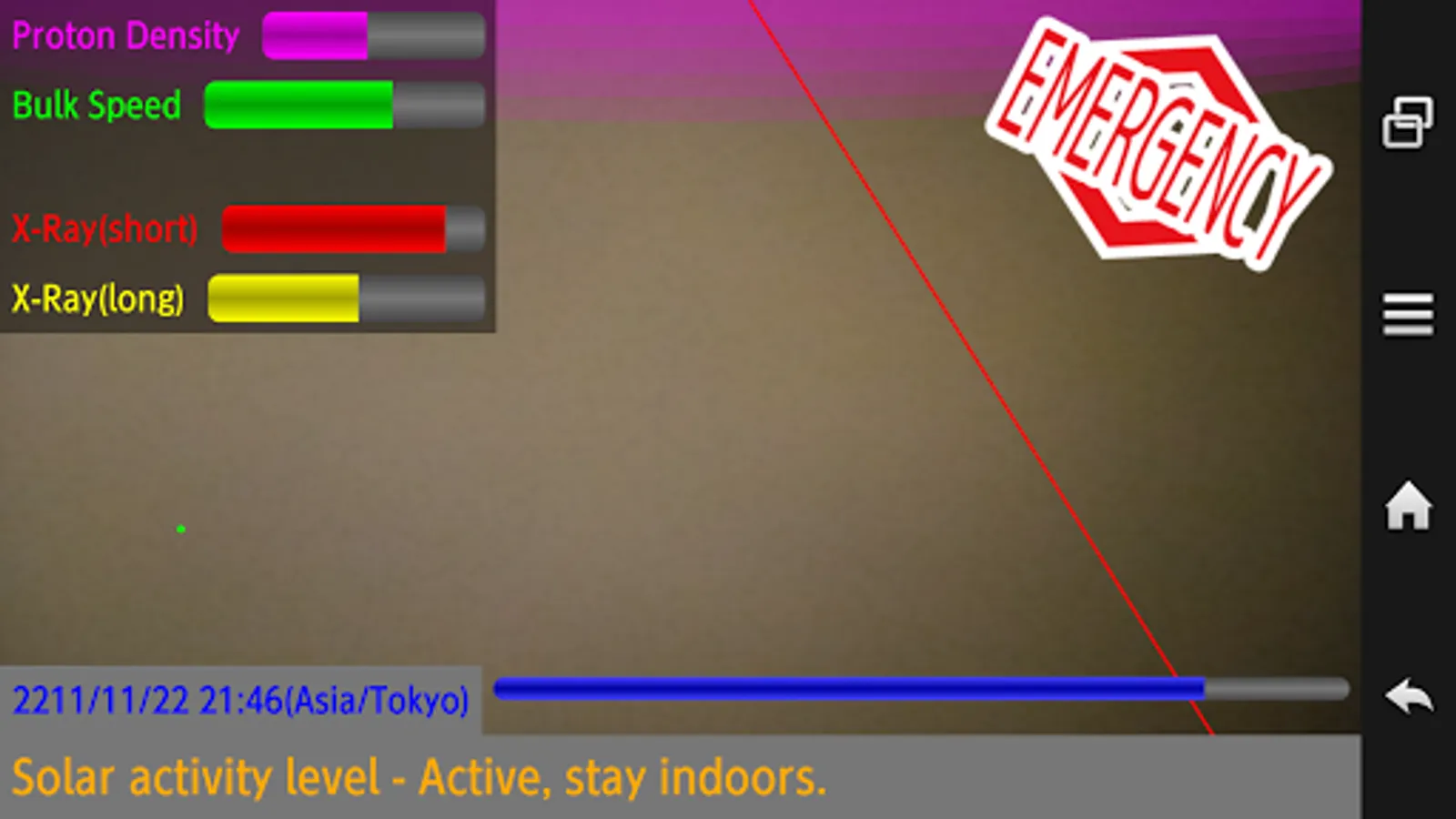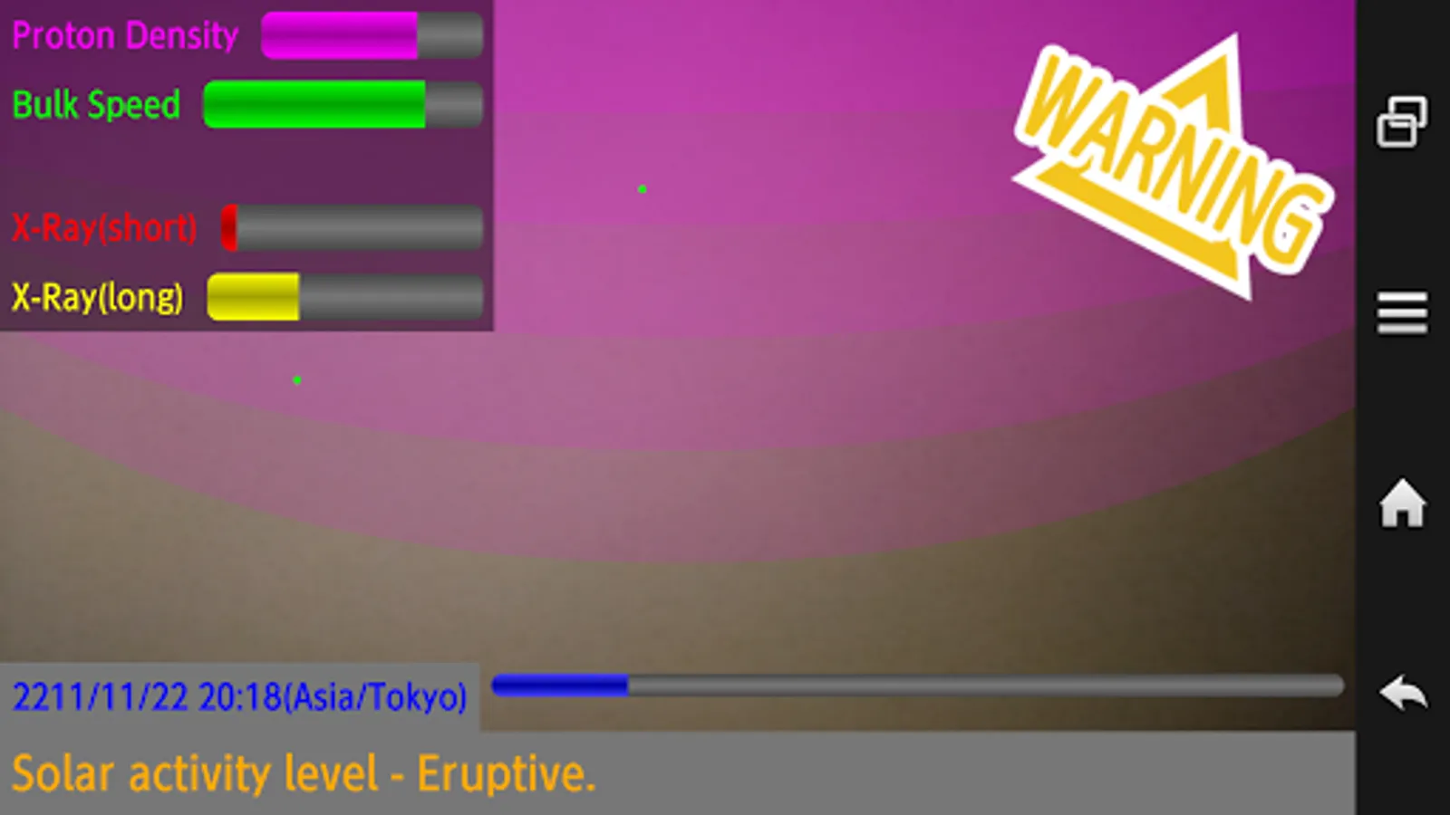 The solar winds generate a beautiful aurora. The high energy particles coming from the sun are not visible to the naked eye. However, they can have a big impact on our lives. This app is intended to alert you in every day's life, via visualization of the solar activity.
