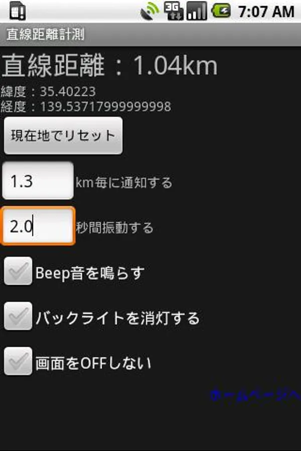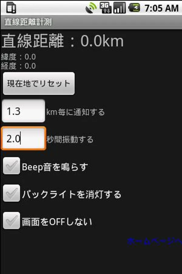 画面は1枚のみで、計測したい距離を入力すると、計測を開始した地点からの直線距離を表示し続けます。指定した距離に到達すると振動し、距離をリセットしてその地点から再度計測、というのを繰り返します。