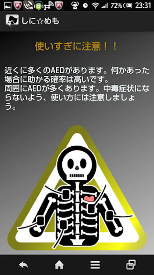 現在地付近のAEDの数、降水量、電力使用量など、実用的なAPIから取得した情報を元にしながら、それを「死亡フラグ」という形で抽象化して表現しています。