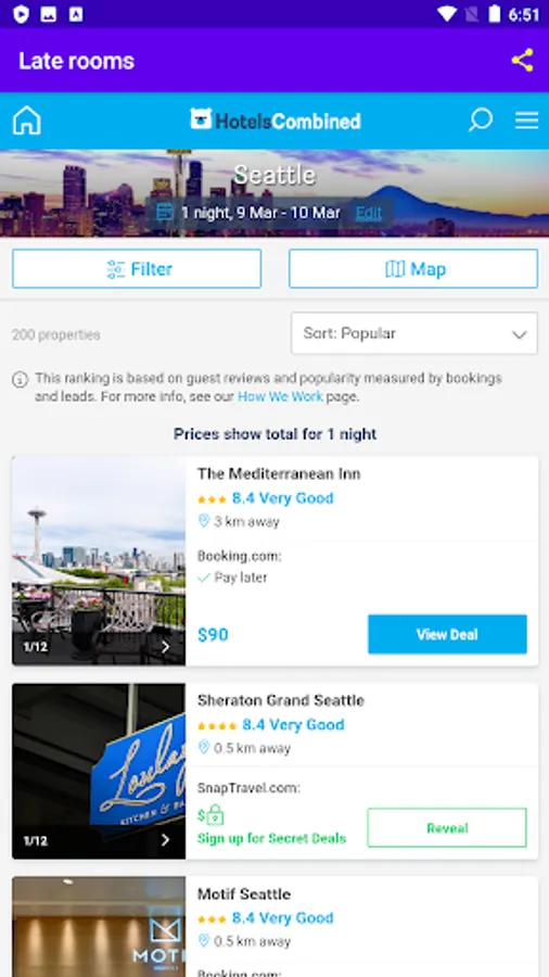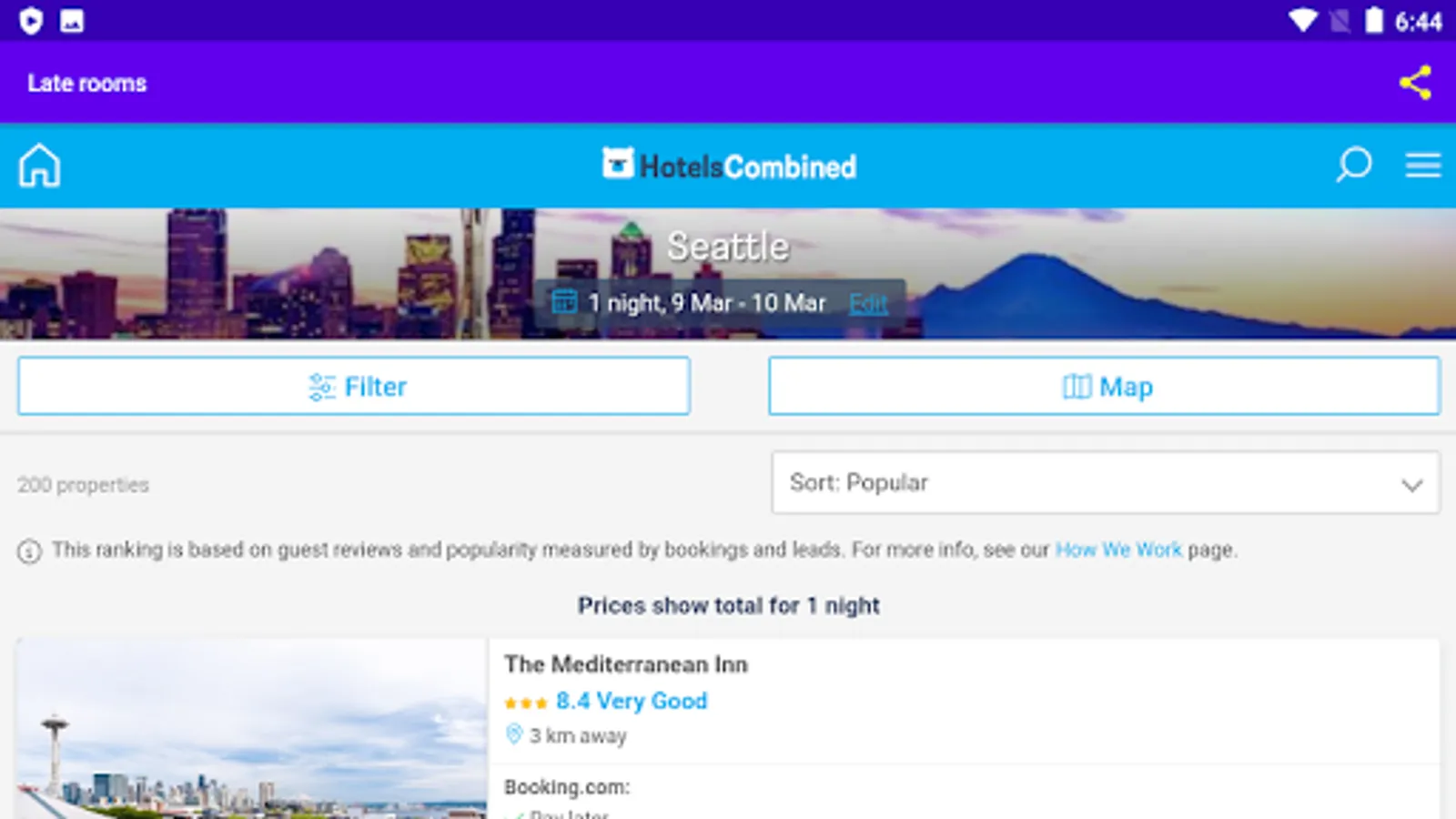 The special filter helps you to find cheap hotels. The Late Rooms app is sorted by price, distance to the city center, discount, classification, location, food and payment, property type, star rating, room facilities, hotel facilities, hotel and popularity.