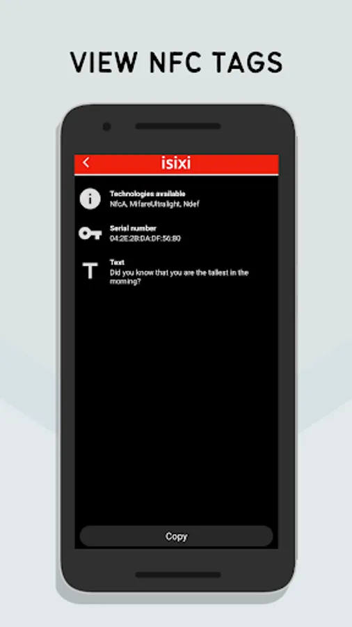 ISIXI zNFC app comes with dual functions which allow users to read Near Field Communication (NFC) tag and write NFC Data Exchange Format (NDEF) messages into NFC-enabled tag.
