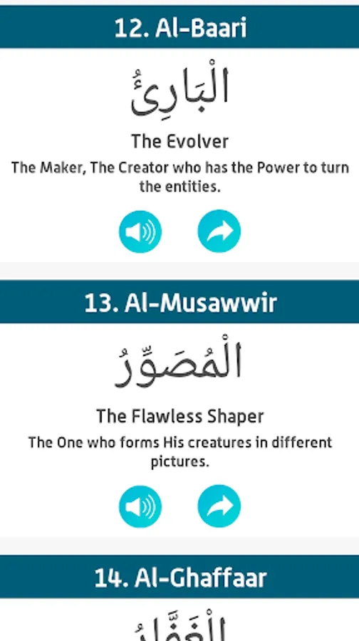 • Read the English Translation of the Meaning of Qur'an in Description for each name.