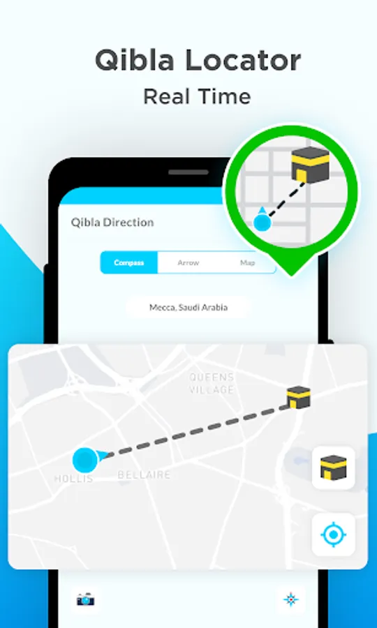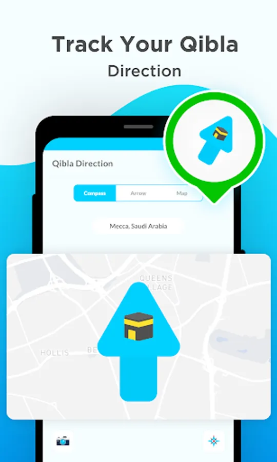 ✓ An arrow on the map to show the Qibla direction