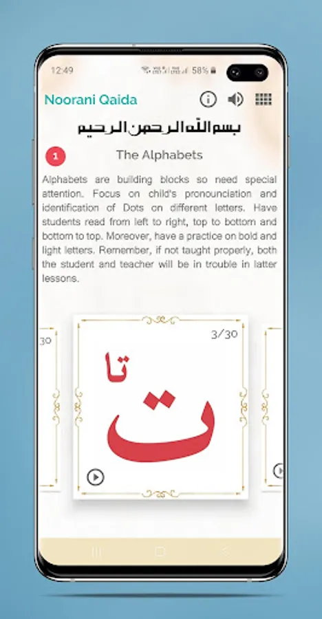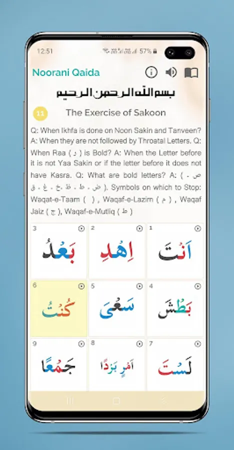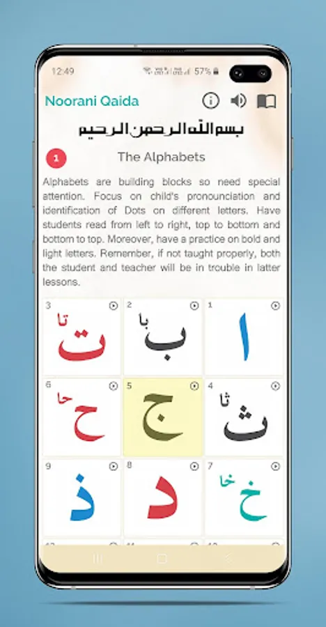 Learn Noorani Qaida without a tutor. Just give approximately an hour daily and learn the Qaida. It is very first book to understand how to read Holy Quran from beginning. Noorani Qaida With Audio and Tajweed helps learn and pronounce Arabic easily.