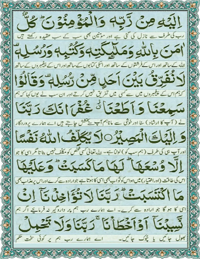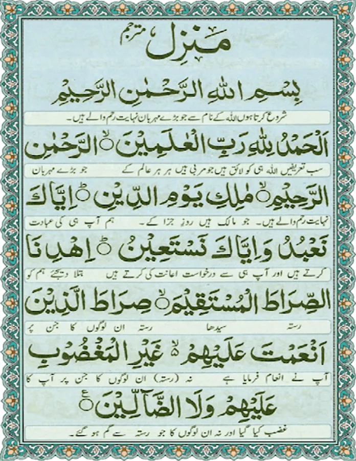 Manzil Dua consists of several verses which are parts of Surah Al-Faatiha, Surah Al-Baqarah, Surah Aal-e-Imran, Surah Al-A'araf, Surah Al-Israa, Surah Al-Muminoon, Surah Al-Saffaat, Surah Al-Rehman, Surah Al-Hashr, Surah Al-Jinn, Surah Al-Kaafiroon, Surah Al-Ikhlas, Surah Al-Falaq, Surah Al-Naas.