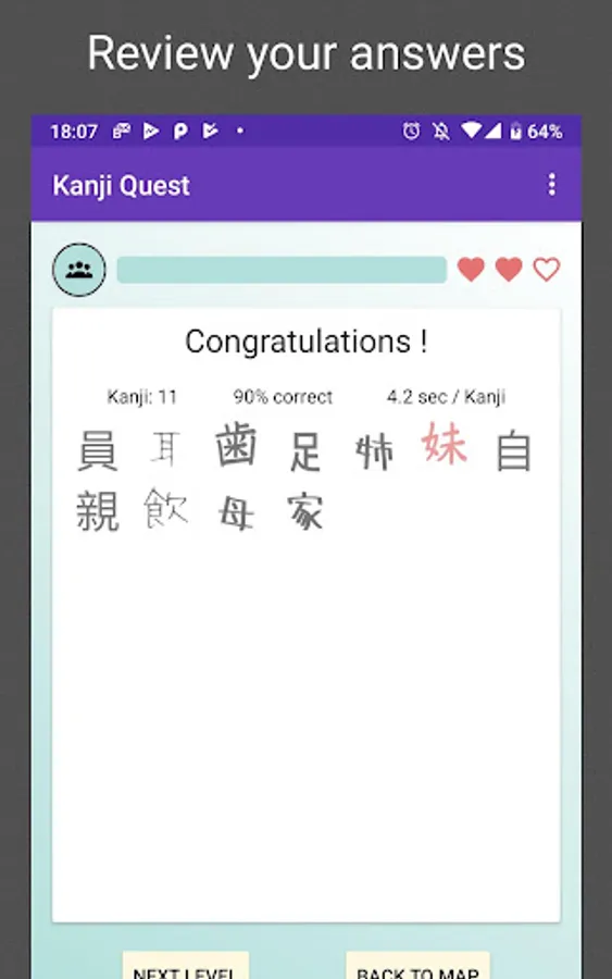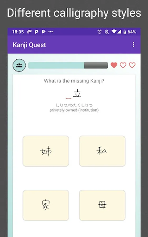 Different from other Kanji memory and learning apps, Kanji Quest presents a variety of fonts and activities to make sure you get used to different drawing styles and calligraphies.