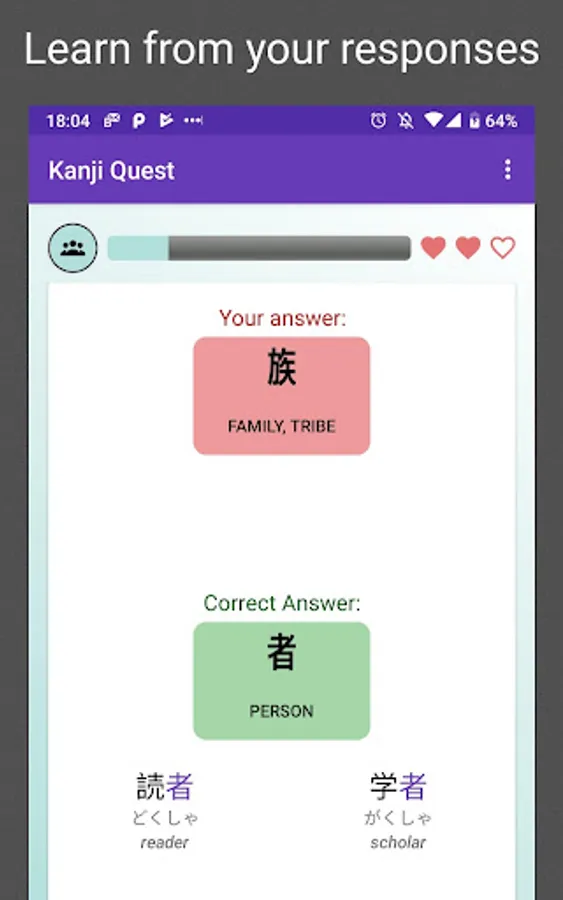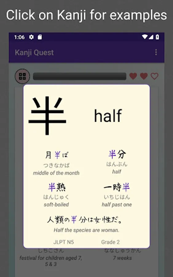 If you get any wrong answer, the game will show different usages of each Kanji so you can learn as you practice. And you can click on any Kanji to see examples of how it is used.