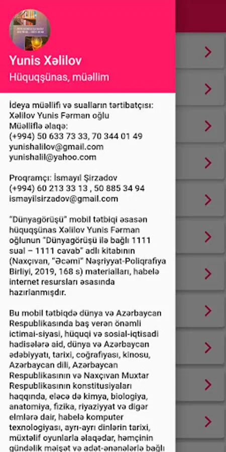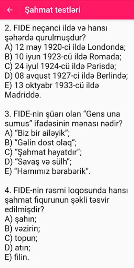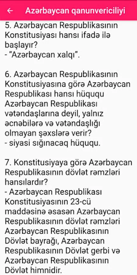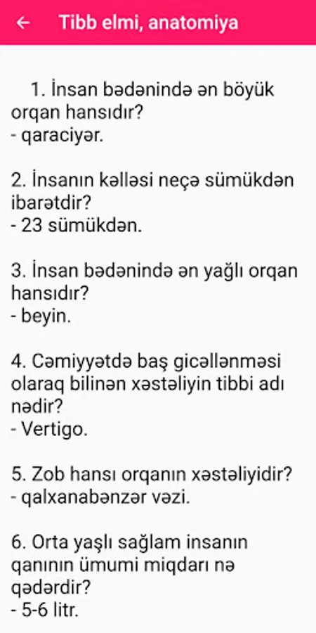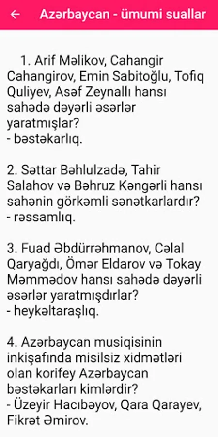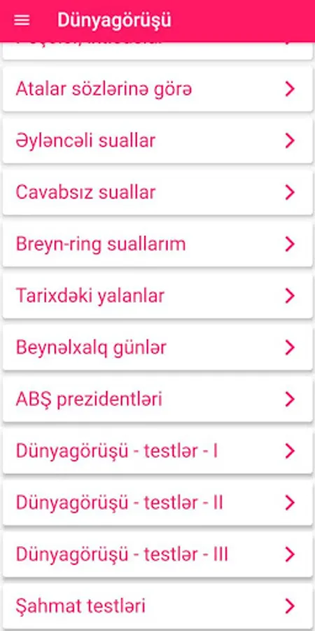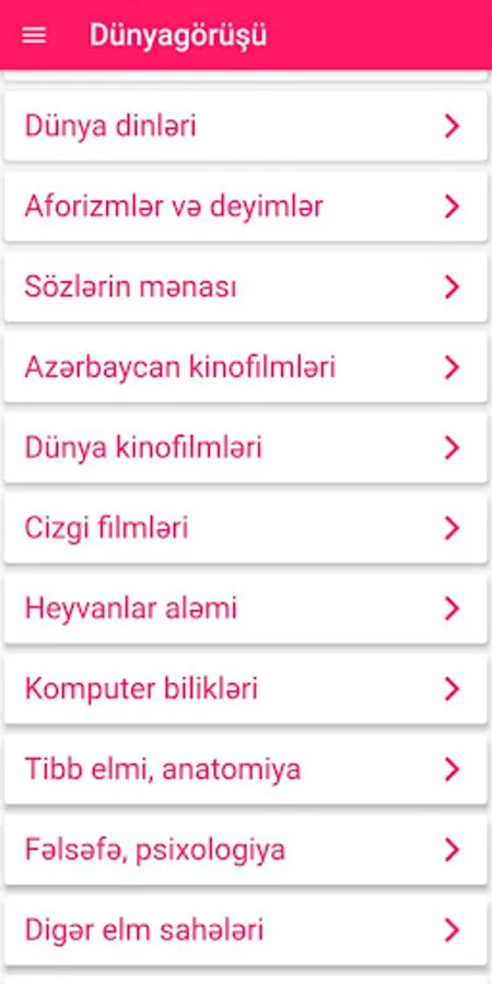 This mobile application covers important socio-political, legal and socio-economic events in the world and the Republic of Azerbaijan, world and Azerbaijani literature, history, geography, cinema, Azerbaijani language, constitutions of the Republic of Azerbaijan and the Nakhchivan Autonomous Republic, as well as chemistry, biology. , about 2,500 questions on anatomy, physics, mathematics and other sciences, as well as computer technology, the history of different religions, various games, as well as everyday life and traditions were answered.