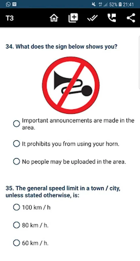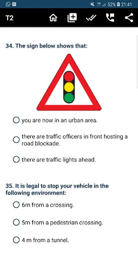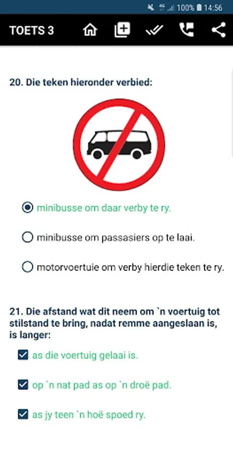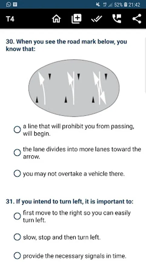- Multiple questions - road rules, road signs and vehicle controls.