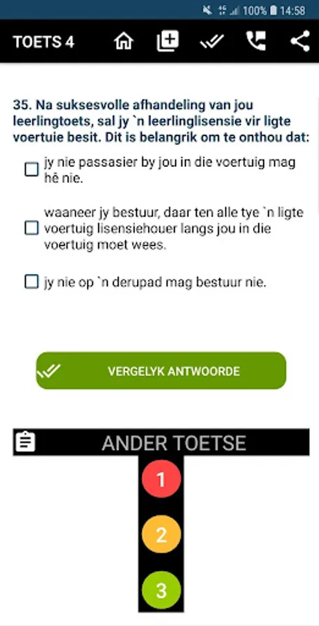 Hierdie app bevat toetse om voor te berei op die K53-leerling Lisensie teoretiese toetse.