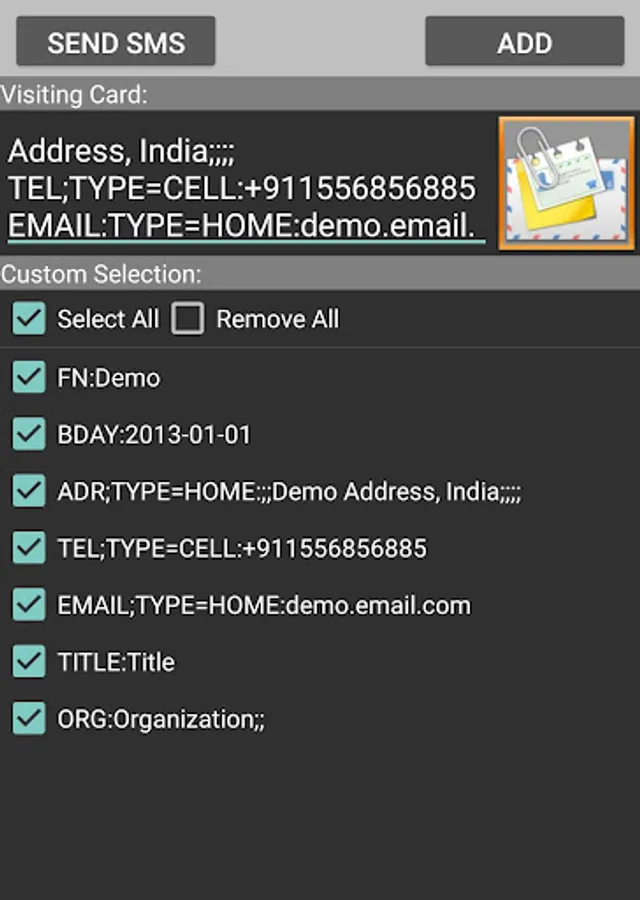 It provides facility to pick contacts from phone, customize it and send business card by SMS.