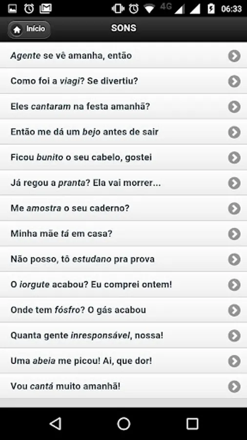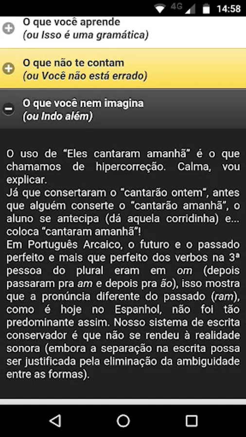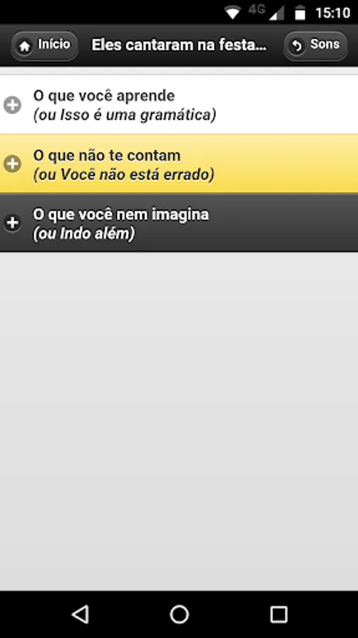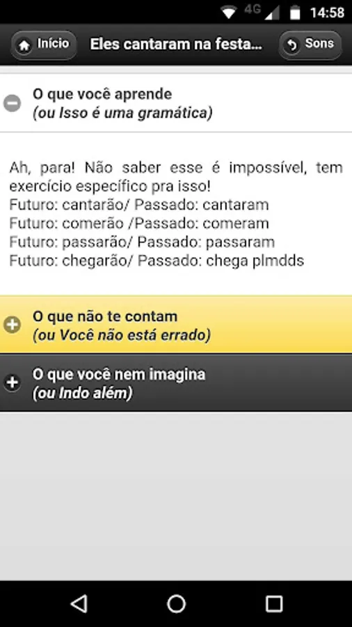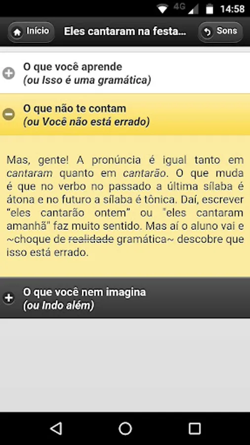 - Divide the "errors" in three categories (sounds, words and phrases) and each category is a list. After choosing the "error", the user is taken to a screen where you can get explanations of various levels, starting with the grammatical explanation, through a brief review and finishing advanced considerations.
