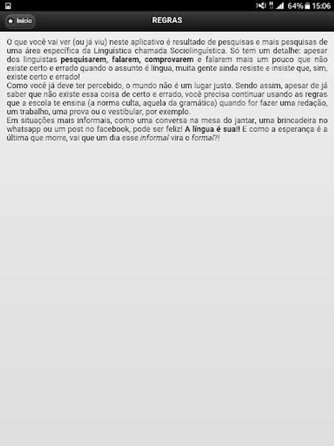 - Designed by a professor of linguistics Uerj prepared by a scientific initiation scholarship from Uerj and developed by a systems development analysis student at Simonsen, this application seeks to disseminate and expand information on the Portuguese spoken in Brazil.