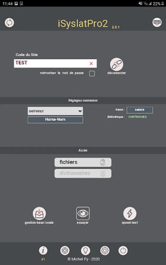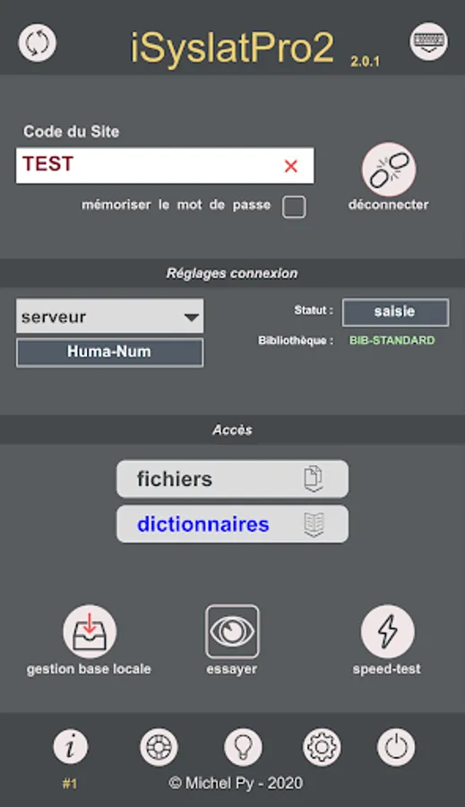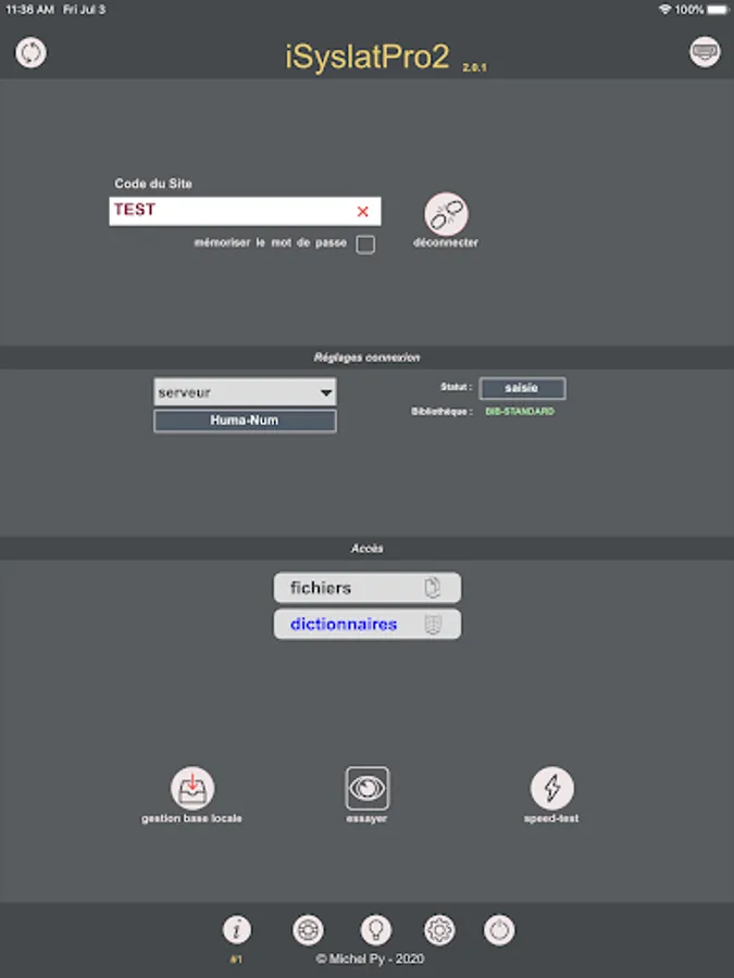 The iSyslatPro2 software is a professional utility intended to record information on the archaeological excavations managed under Syslat system. It is a complementary tool to the Syslat-Terminal software which allows access with an iPhone or an iPad to the Syslat databases previously installed on Huma-Num servers or on any other server. It is also possible to import databases from the server to consult or modify them in local configuration (including offline).