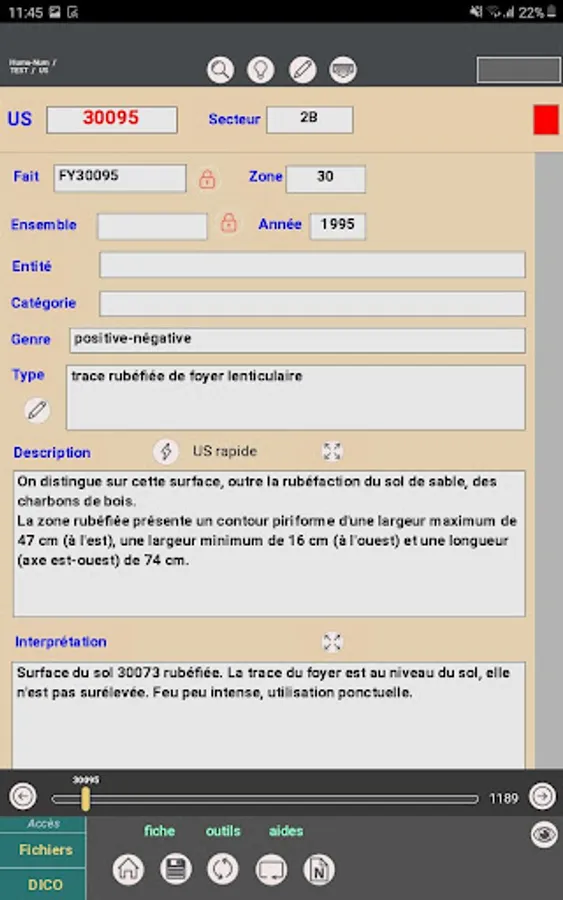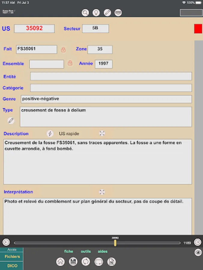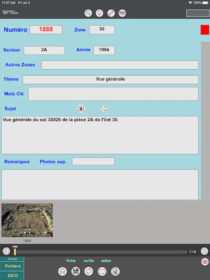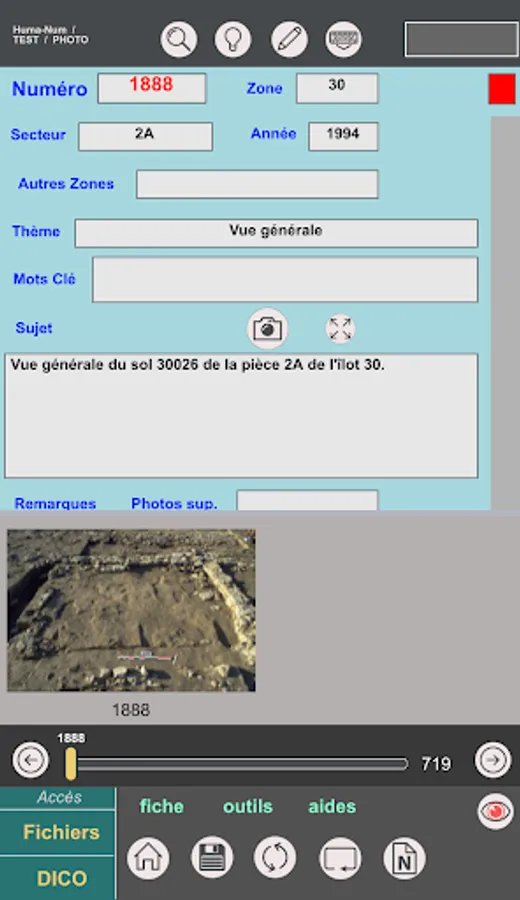 The software works as well in Wifi as in 3G / 4G. Eight files are currently installed in iSyslatPro2: the US, FACT and ENS files for the management of the terrain, PHOTO and DOC for the management of photographic and graphic documentation, MOBI, CER and TYPOCER for the management of archaeological furniture.