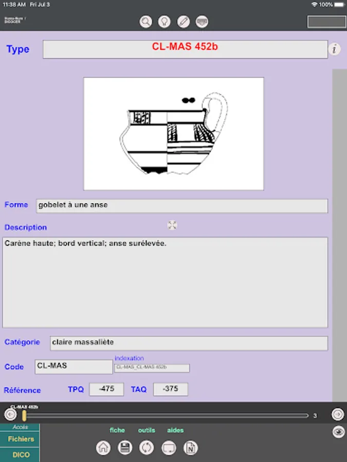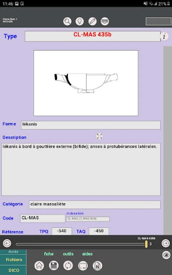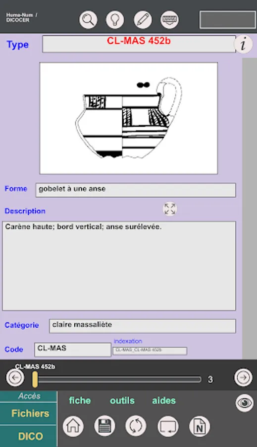 It also allows you to consult three reference dictionaries: the first for Mediterranean ceramics (DICOCER), the second for pre-Augustian coins from the South of France (DICOMON), the third for other objects from the Iron Age. Noon (DICOBJ).