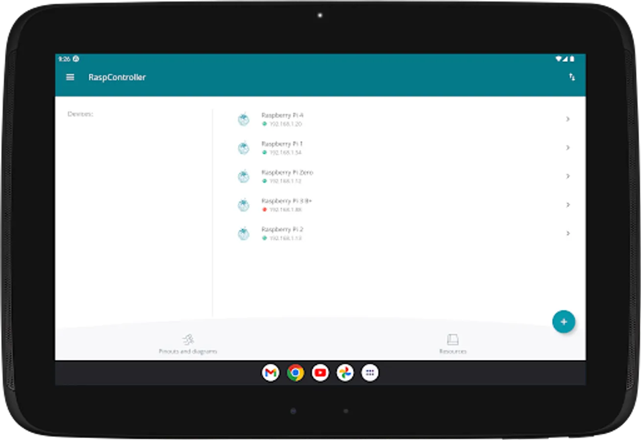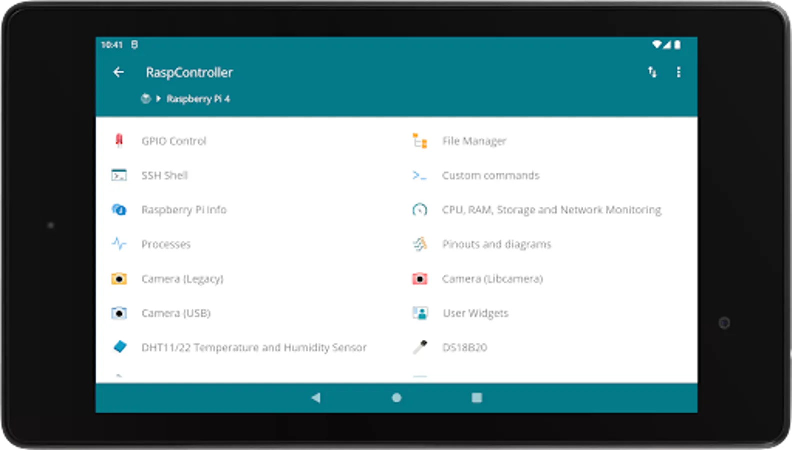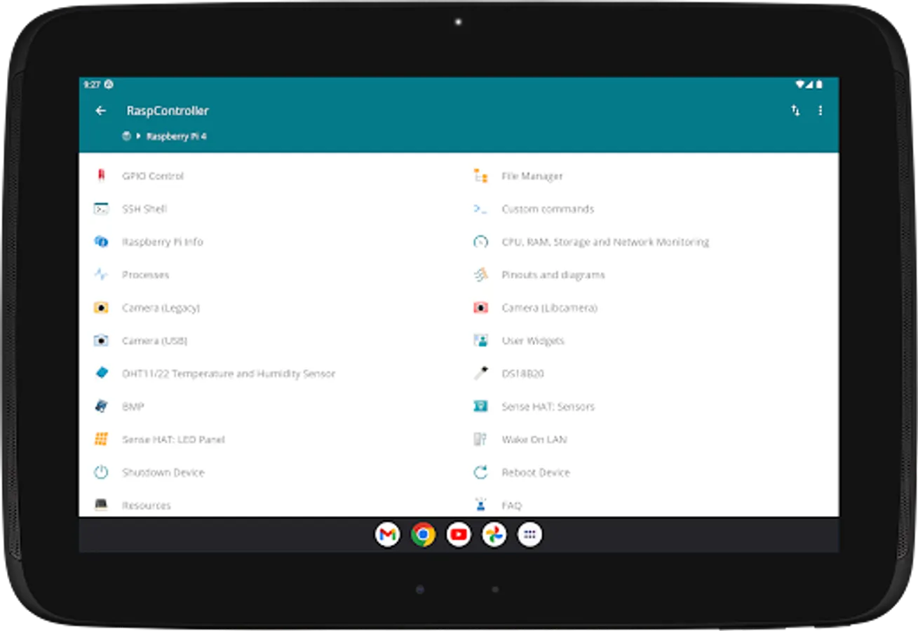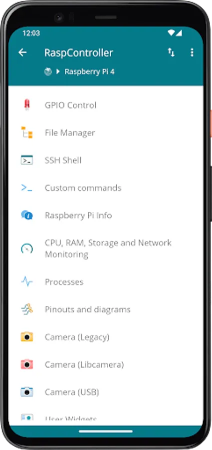 The RaspController application allows you to easily manage your Raspberry Pi remotely. Now it is possible manage files, to control the GPIO ports, send commands directly through the terminal, view images from a connected camera and obtain data from different sensors. Finally, wiring diagrams, pins and various information are available for the correct use of the Raspberry Pi.