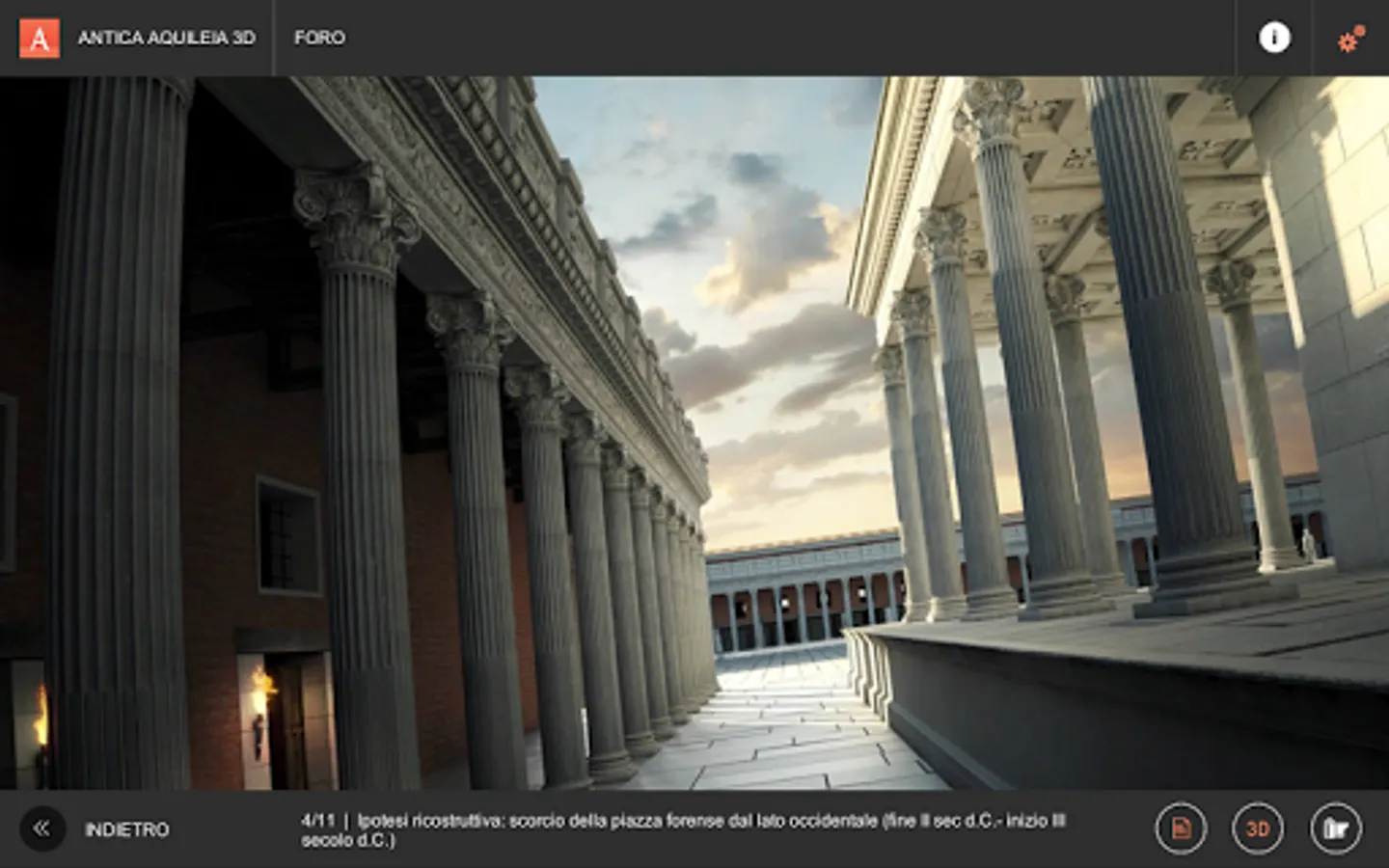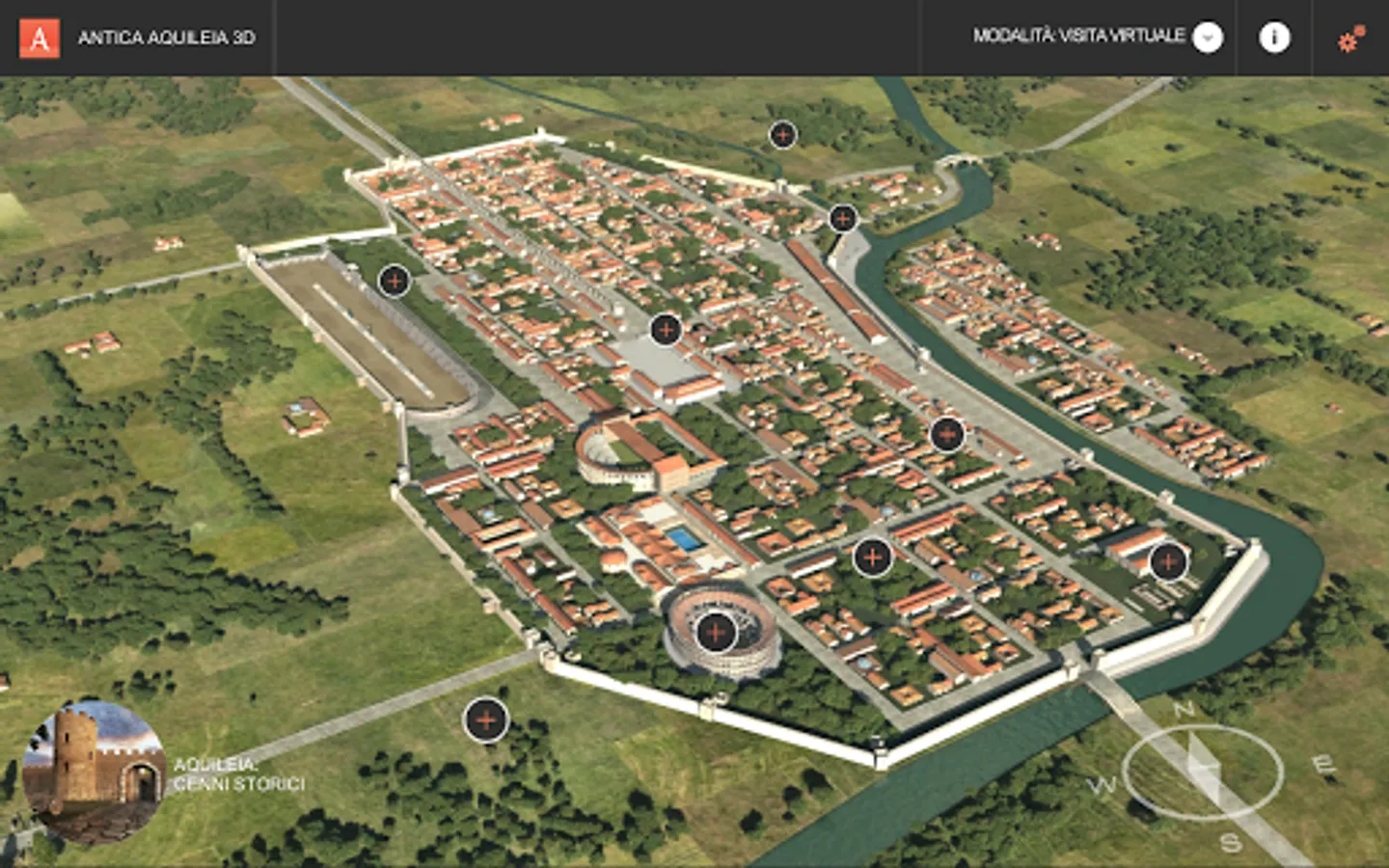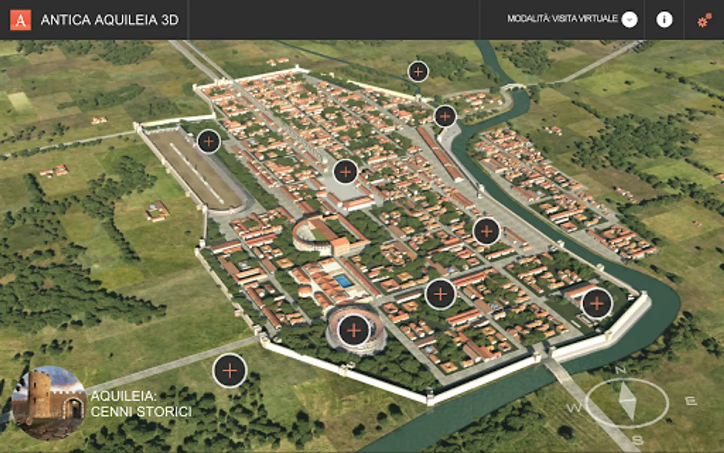 "Old Aquileia 3D" combines virtual reconstructions, video and interactive explorations of the main monuments, allowing visitors to use their device as a "time window" and as an interactive video guide.