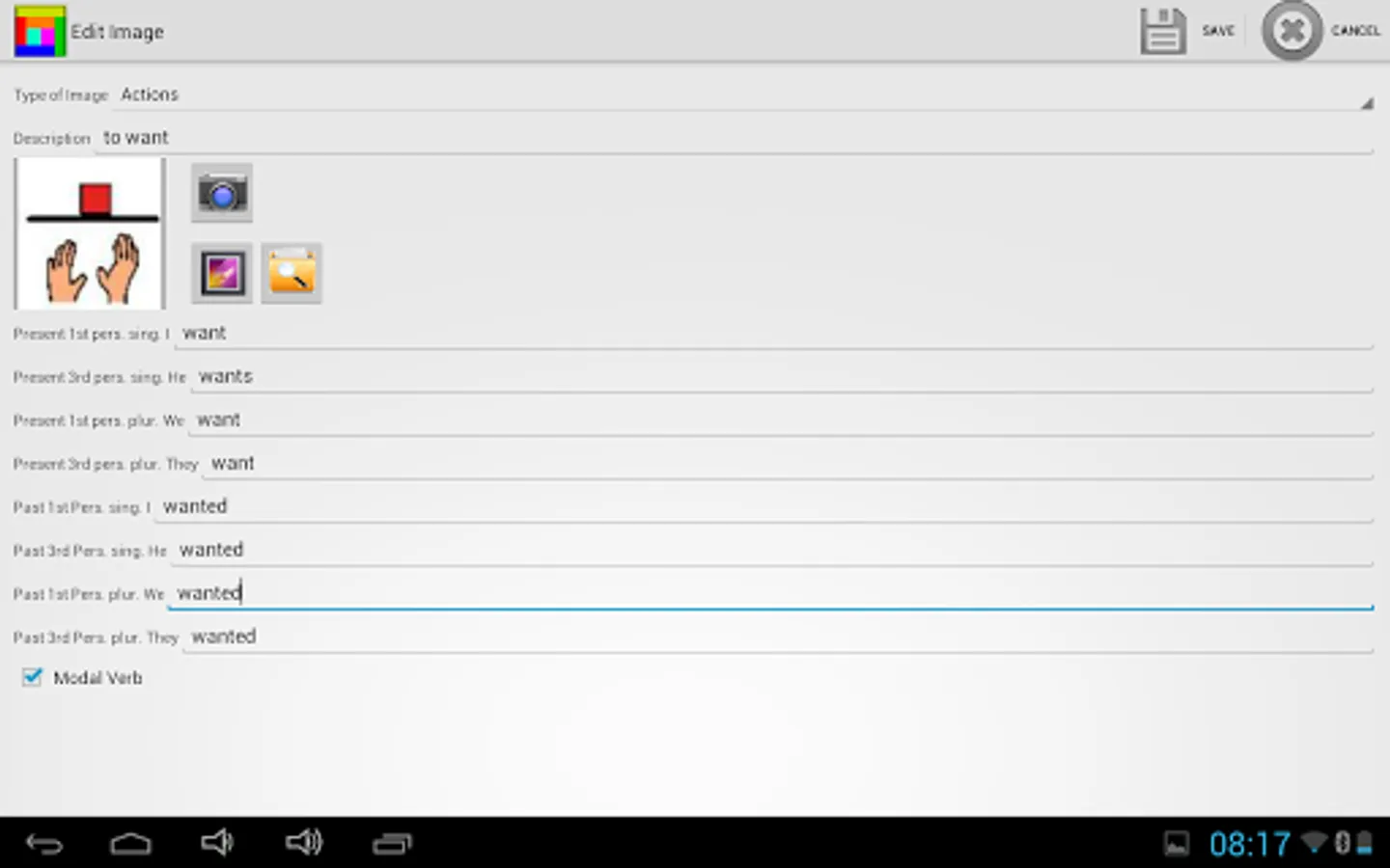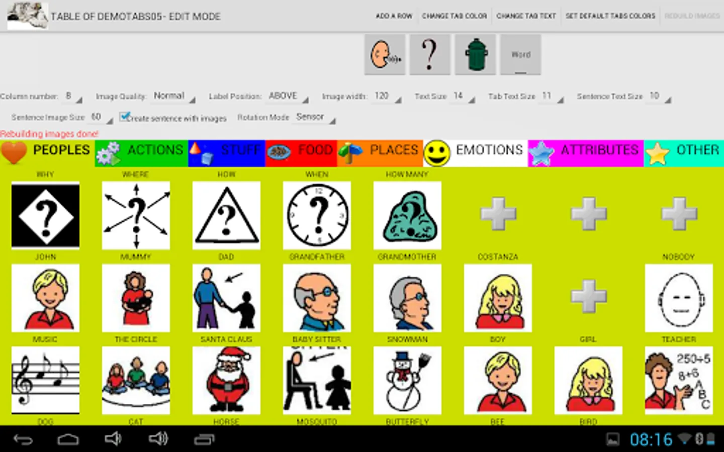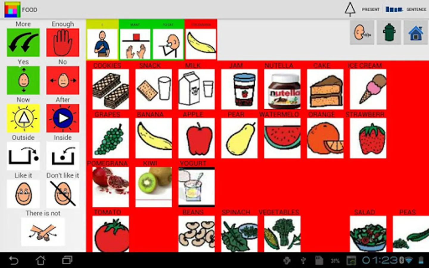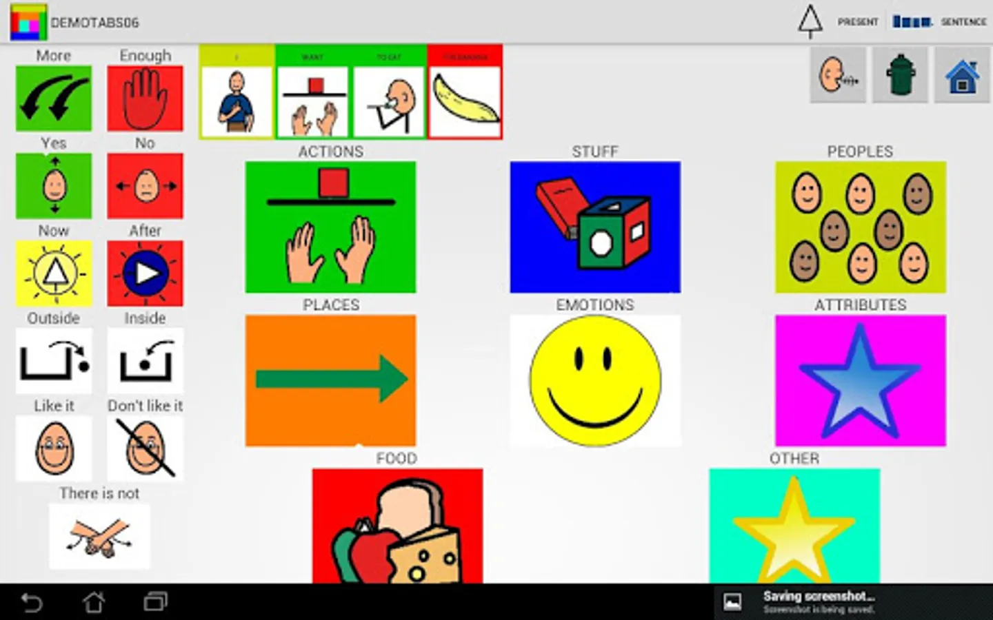 The tables are divided into 8 categories, People, Actions, Emotions, Objects, Food, Places, Adjectives, Other. You can decide to build a simple phrase or tap and talk.