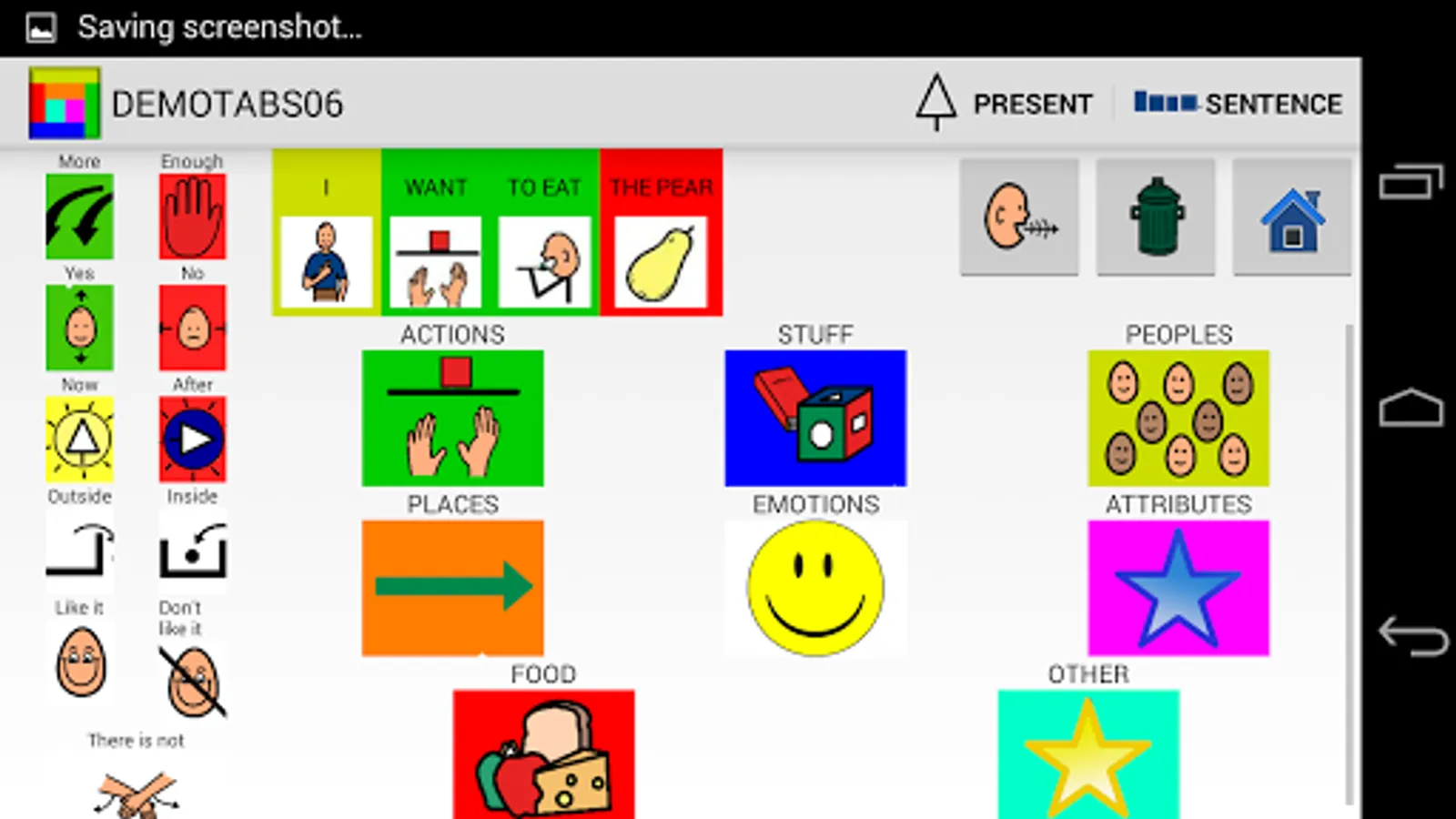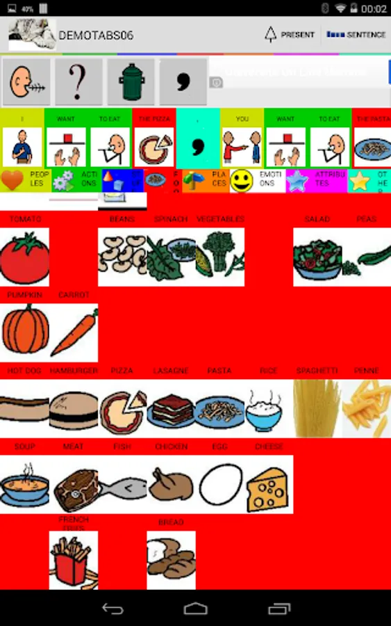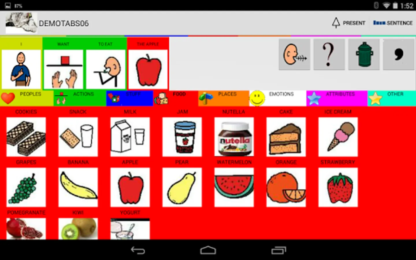 The tables are divided into 8 categories, People, Actions, Emotions, Objects, Food, Places, Adjectives, Other. You can decide to build a simple phrase or tap and talk.