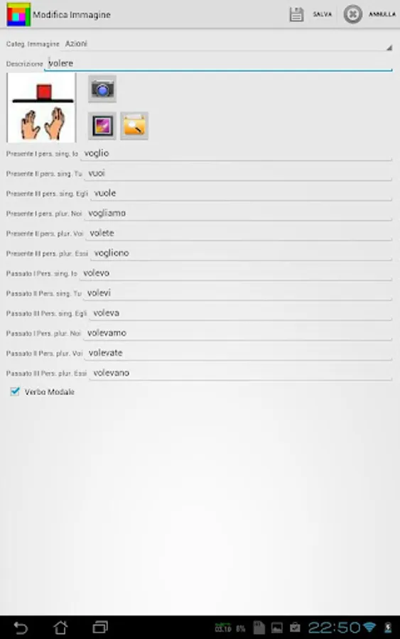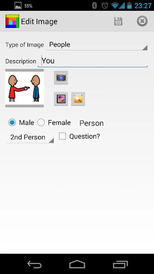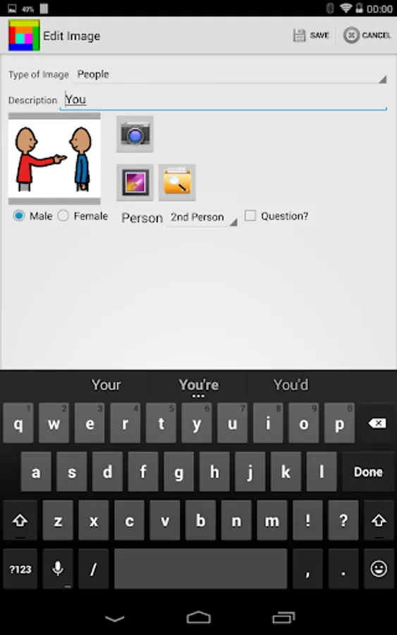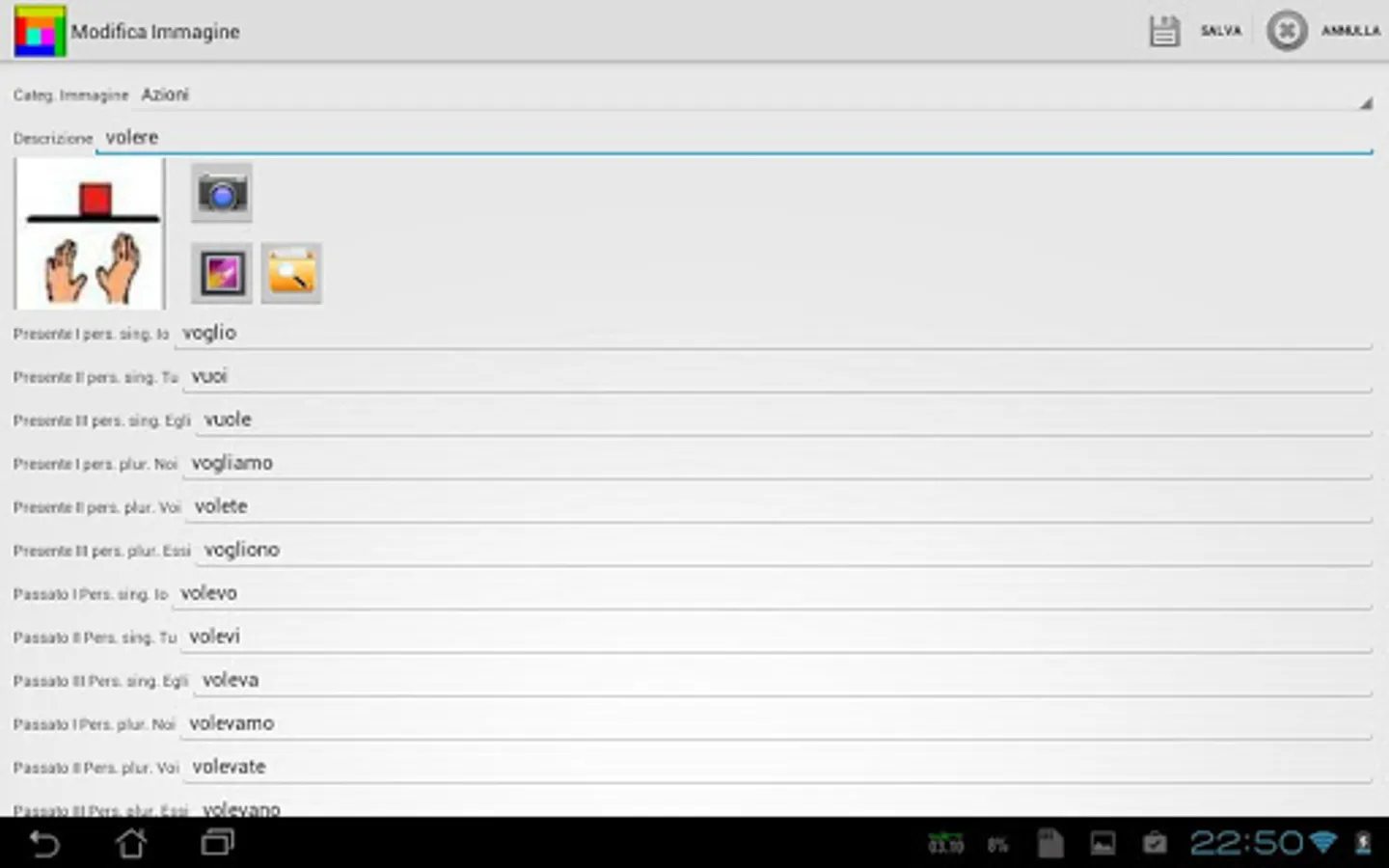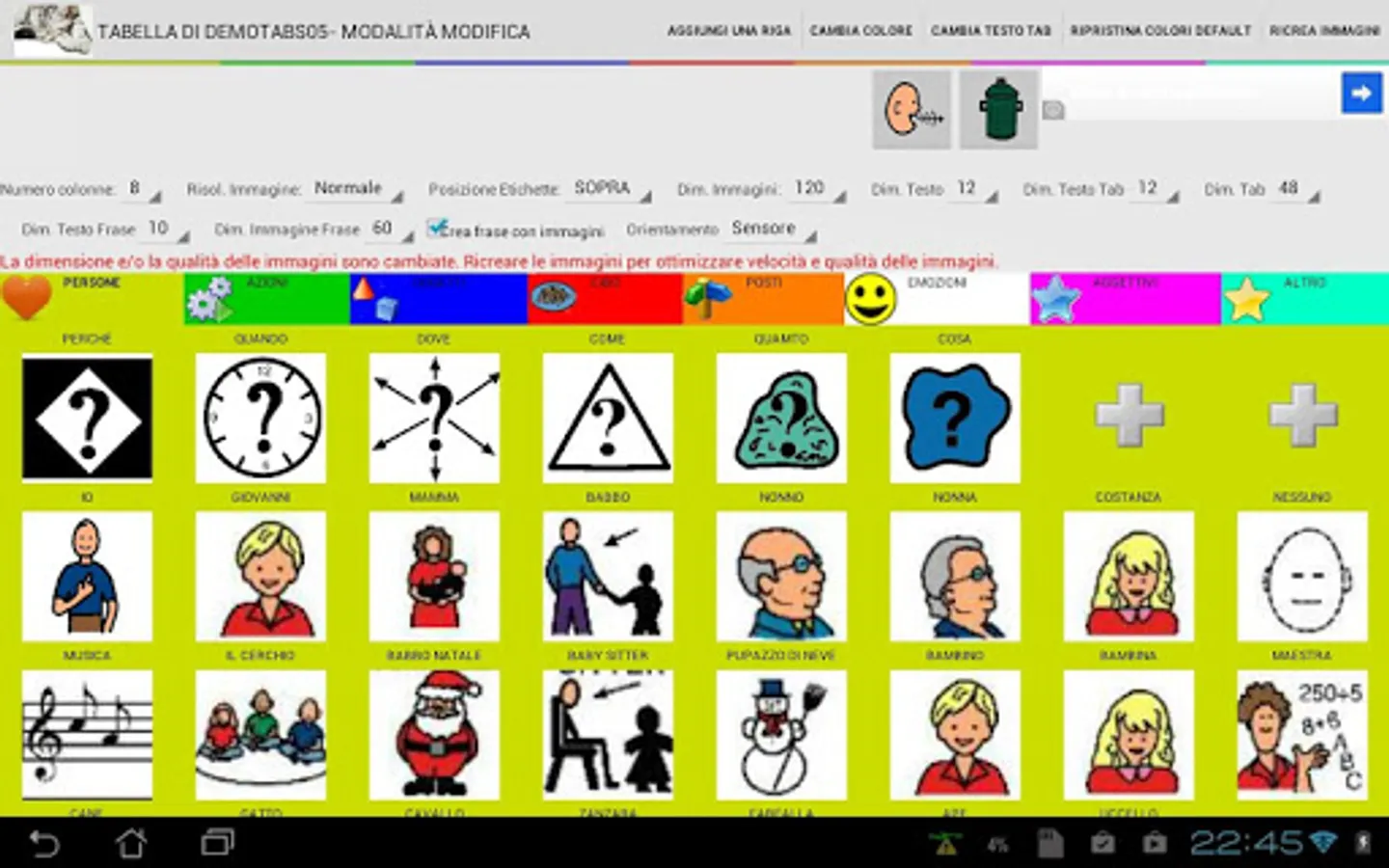 The tables are divided into 8 categories, People, Actions, Emotions, Objects, Food, Places, Adjectives, Other. You can decide to build a simple phrase or tap and talk.