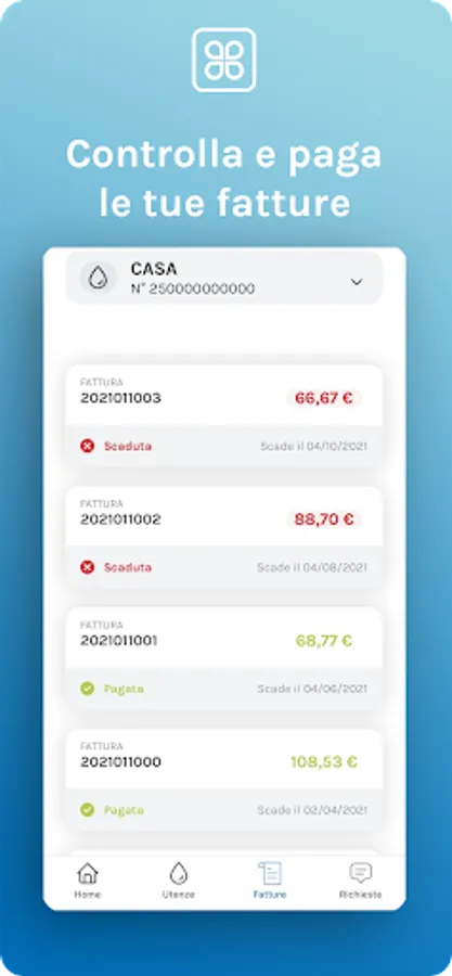 - Invoices and payments: you can consult all your bills, download them and pay them directly via the app with your credit card, in complete safety;