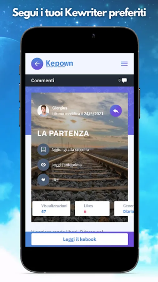 Innovative in functionality and simple to use, the Kepown App is designed for the reader who wants to read freely, even offline. Kepown reader is directly connected to the new great planet of writers where the Kepowners who inhabit it are giving life to the new literary civilization made up of true stories, tales, but also of imaginary and published stories. Discover them all.