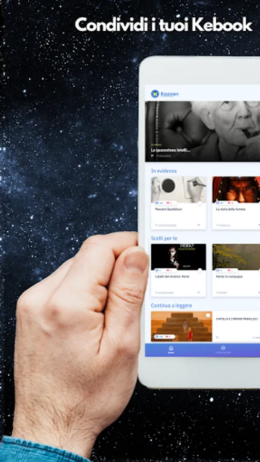 Library section: you are in the center of the planet Kepown. Inside the "Library" you can discover all the Kebooks you want. You can start reading freely or you can save the Kebooks in "My Shelf". You can sort the Library in chronological order, rating and by number of views.