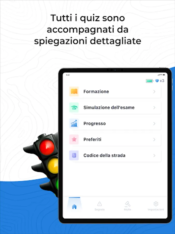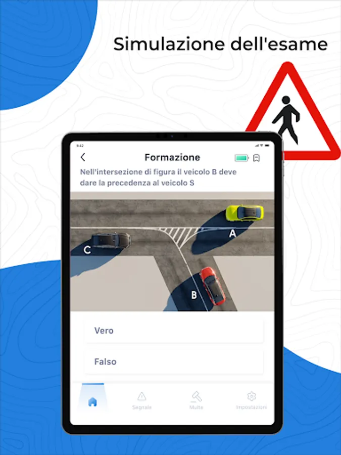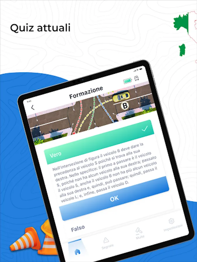 Prepare yourself as best as possible for the driving license exam thanks to the "Italian Official Driving License Quiz". Your road safety is important to us, which is why we provide you with a complete and quick learning tool.