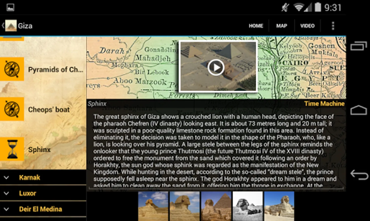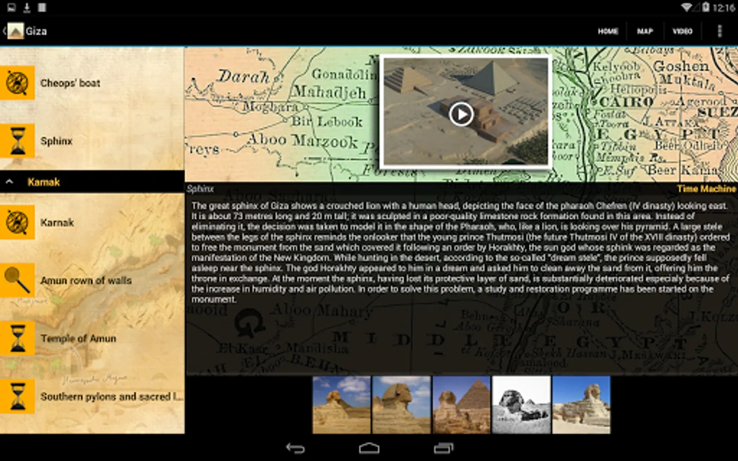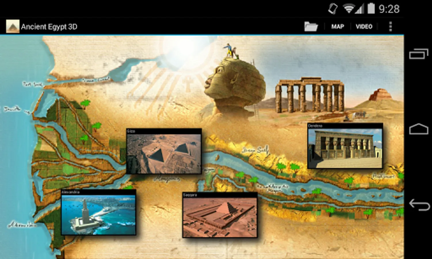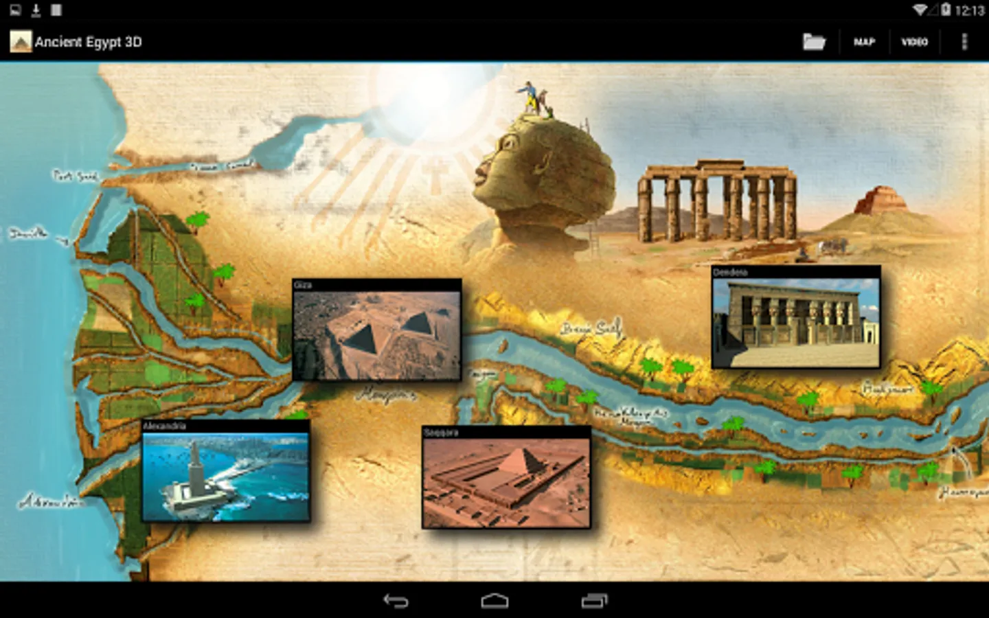 The Nile: The major sites of Ancient Egypt are displayed on the map. Taking a horizontal swipe across the screen moves us along the Nile discovering new sites